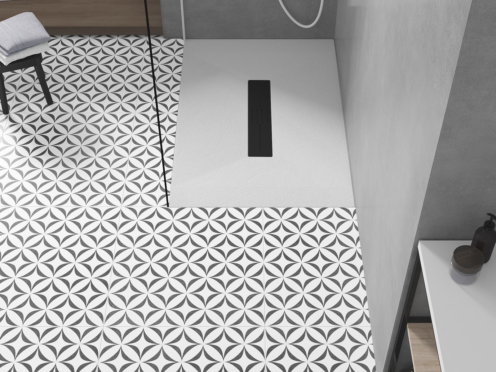 Η επιφάνεια της ντουζιέρας με τη δομή της θυμίζει πέτρα. Αποτελεί έναν εξαιρετικό συνδυασμό φυσικής εμφάνισης με σύγχρονη εσωτερική διαρρύθμιση. Προσθέτει χαρακτήρα, υπογραμμίζει την αισθητική και την κομψότητα της διακόσμησης του μπάνιου και εντυπωσιάζει με τη μορφή της.