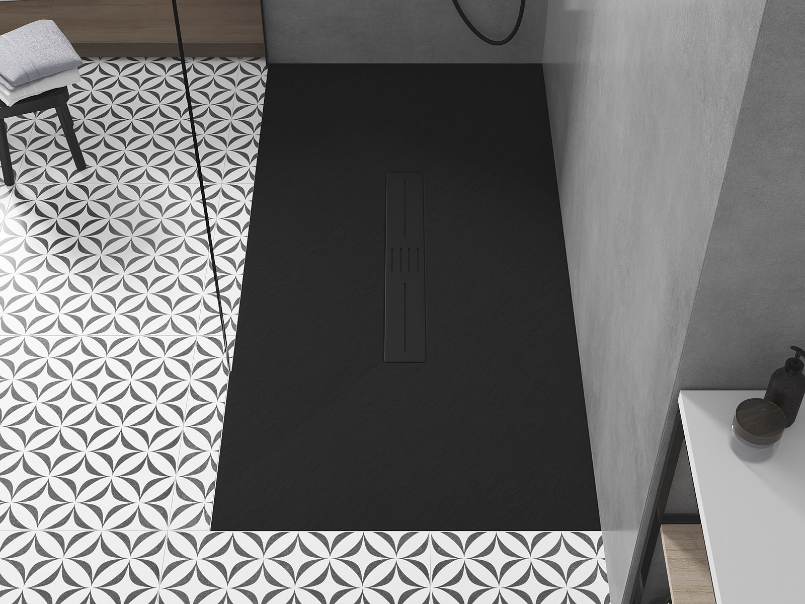 Η επιφάνεια της ντουζιέρας με τη δομή της θυμίζει πέτρα. Αποτελεί έναν εξαιρετικό συνδυασμό φυσικής εμφάνισης με σύγχρονη εσωτερική διαρρύθμιση. Προσθέτει χαρακτήρα, υπογραμμίζει την αισθητική και την κομψότητα της διακόσμησης του μπάνιου και εντυπωσιάζει με τη μορφή της.