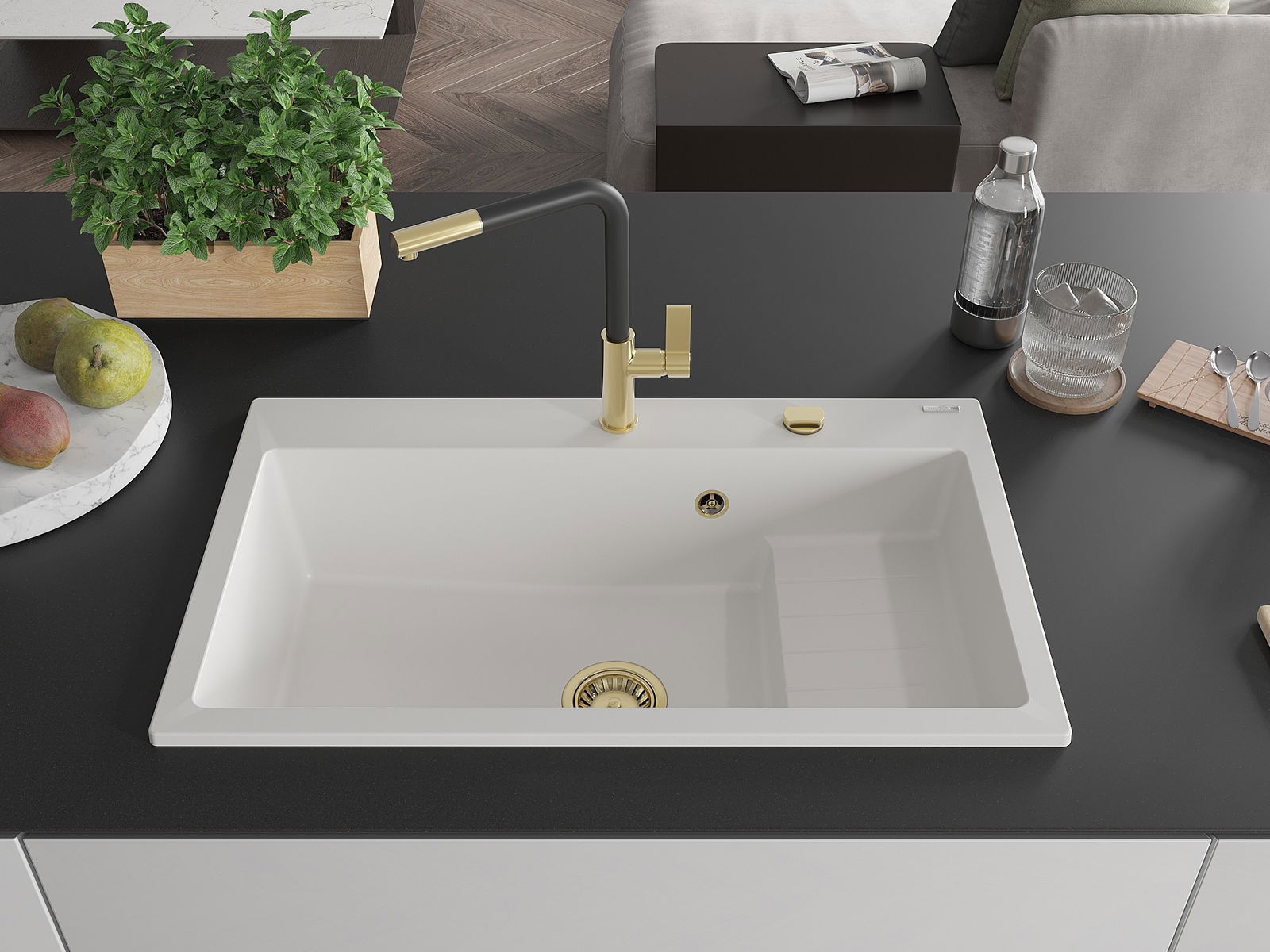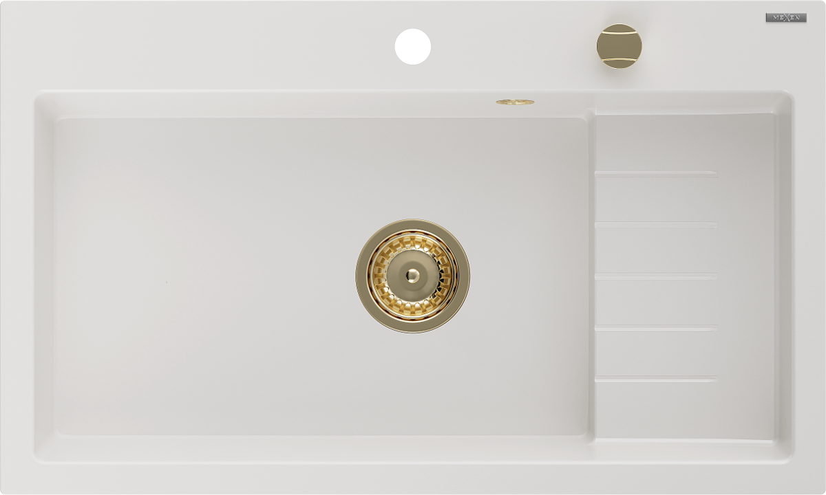 Mexen Omar νεροχύτης γρανίτη 1-θαλάμου 800 x 480 mm, λευκός, χρυσό σιφόνι