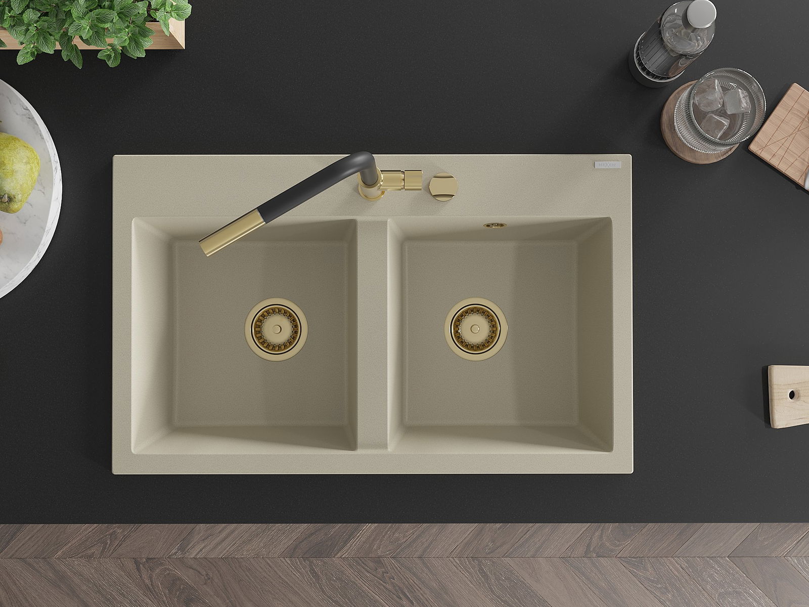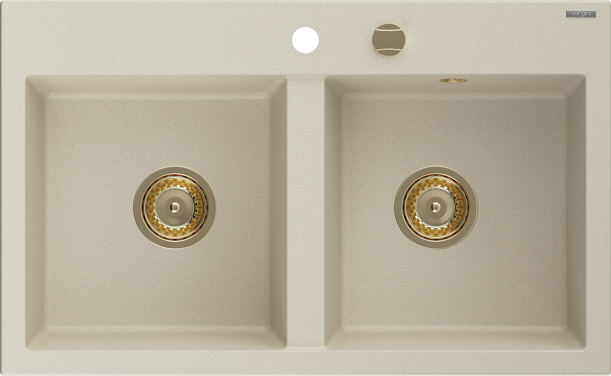 Mexen Hektor νεροχύτης γρανίτης 2-θέσεος 800 x 480 mm, μπεζ, σιφόνι χρυσό