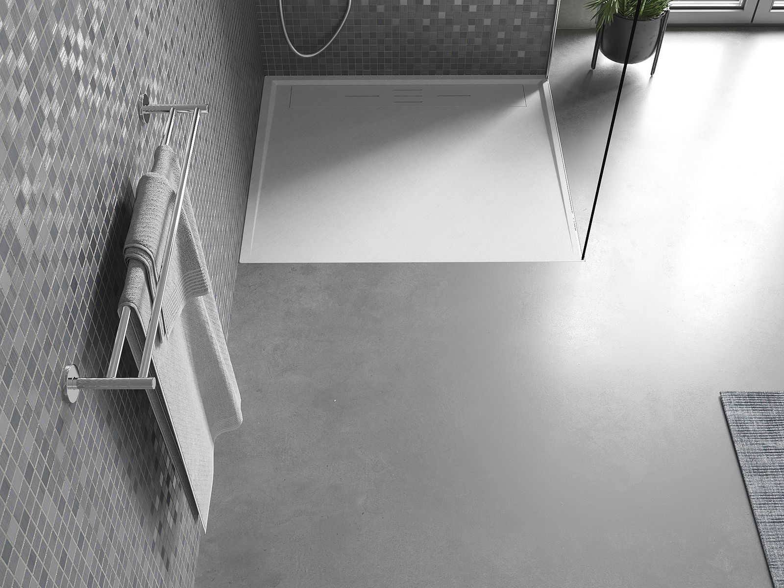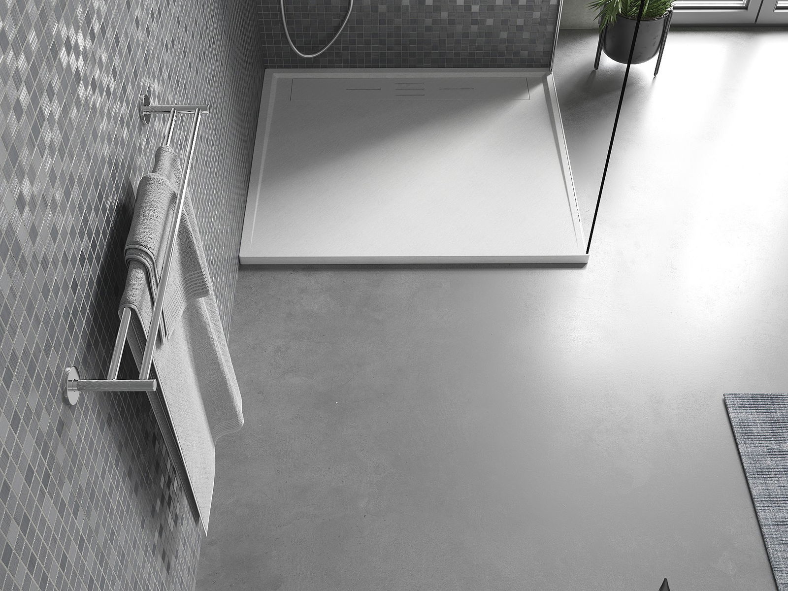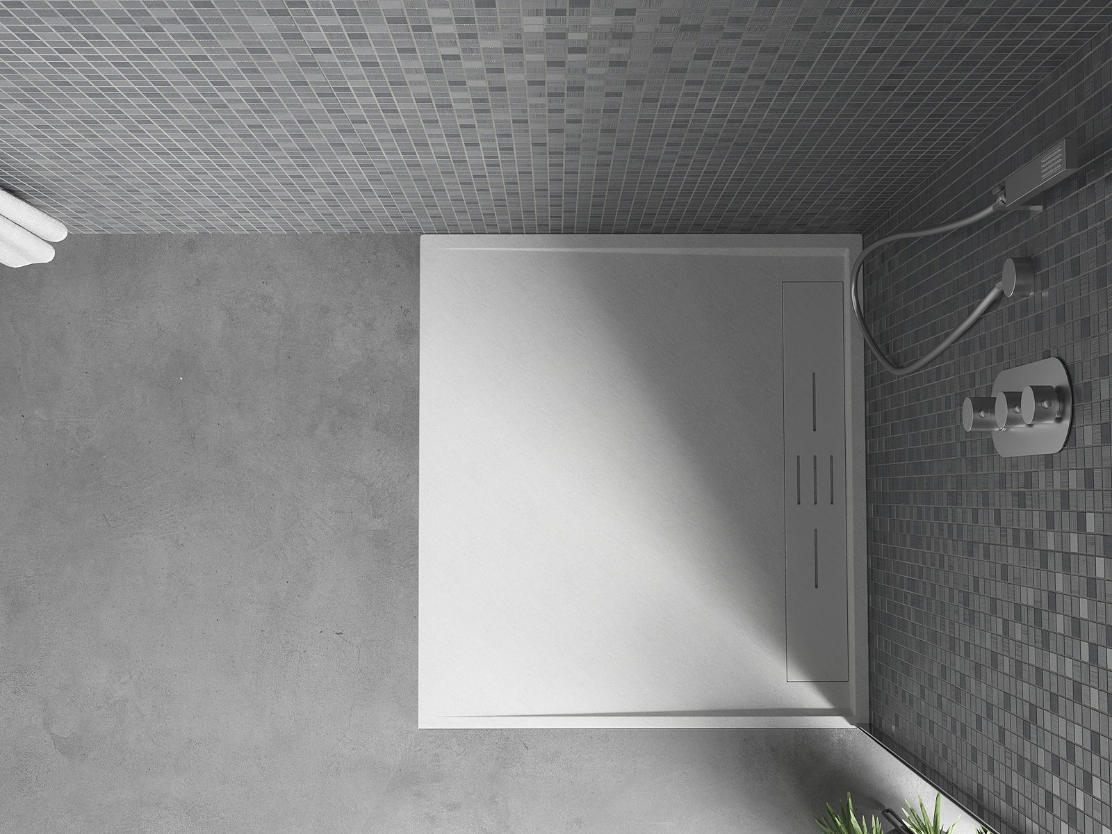 Η επιφάνεια της ντουζιέρας με τη δομή της θυμίζει πέτρα. Αποτελεί έναν εξαιρετικό συνδυασμό φυσικής εμφάνισης με σύγχρονη εσωτερική διαρρύθμιση. Προσθέτει χαρακτήρα, υπογραμμίζει την αισθητική και την κομψότητα της διακόσμησης του μπάνιου και εντυπωσιάζει με τη μορφή της.