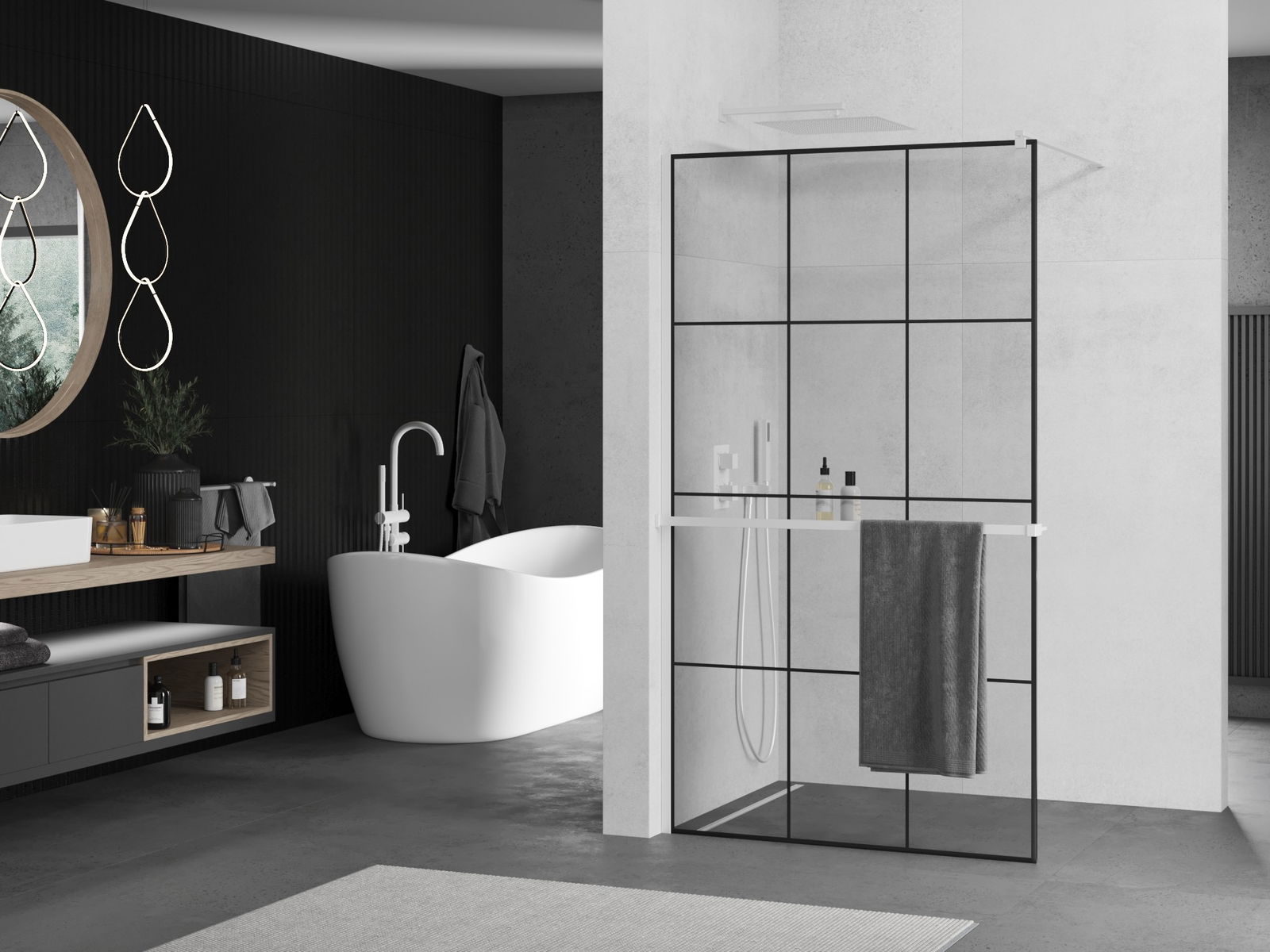 Mexen Kioto+ Πάνελ ντους με ράφι Walk-in 110 x 200 εκ., μαύρο πλέγμα, λευκό