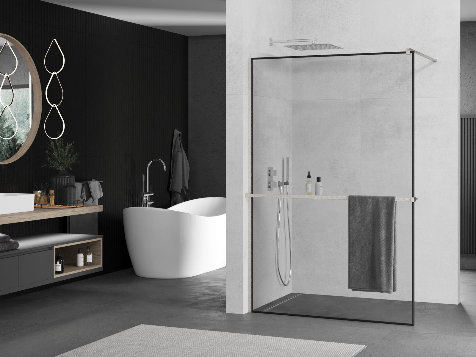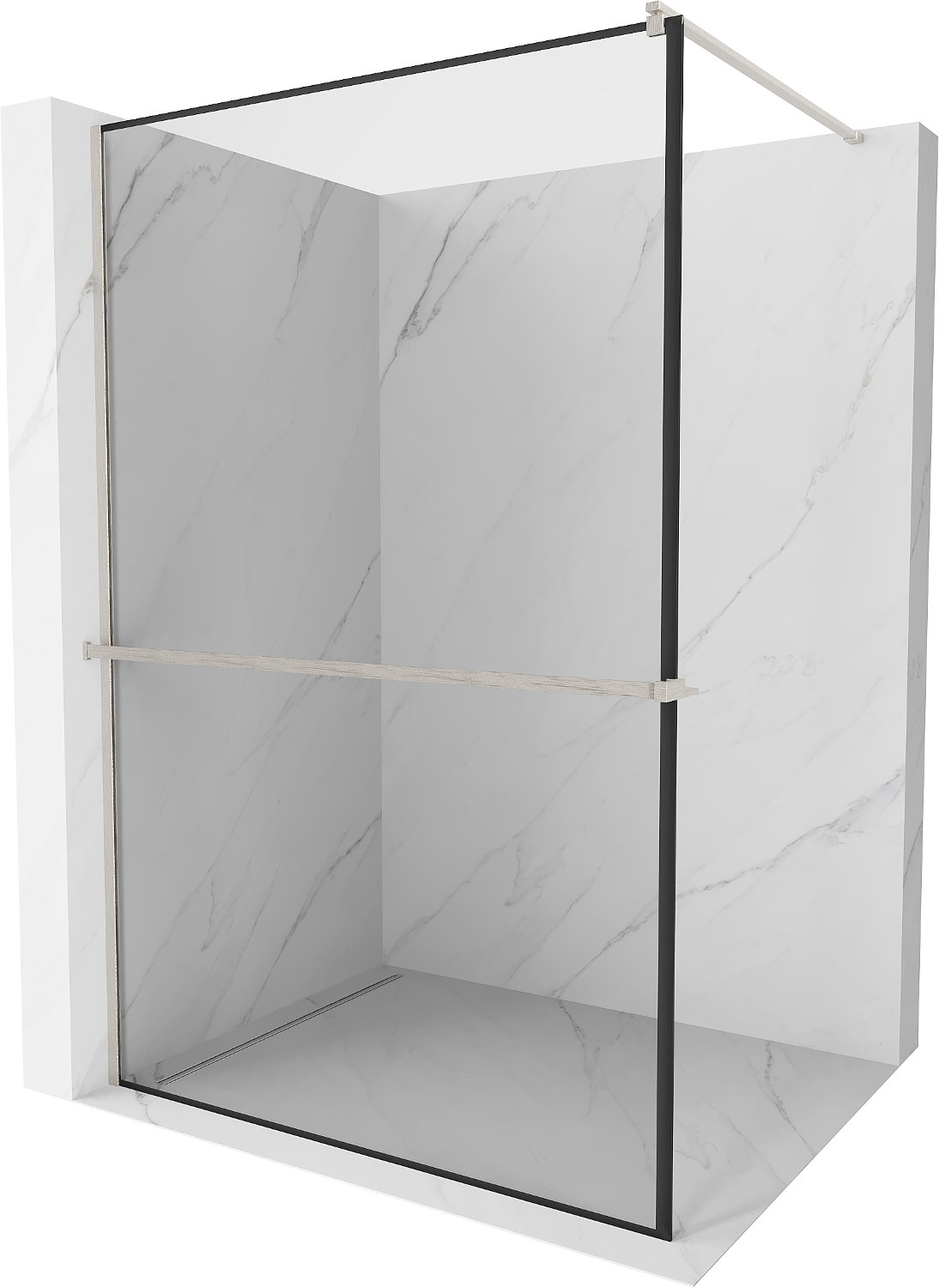 Mexen Kioto+ Πάνελ ντους με ράφι Walk-in 80 x 200 cm, μαύρο πλαίσιο, βουρτσισμένο