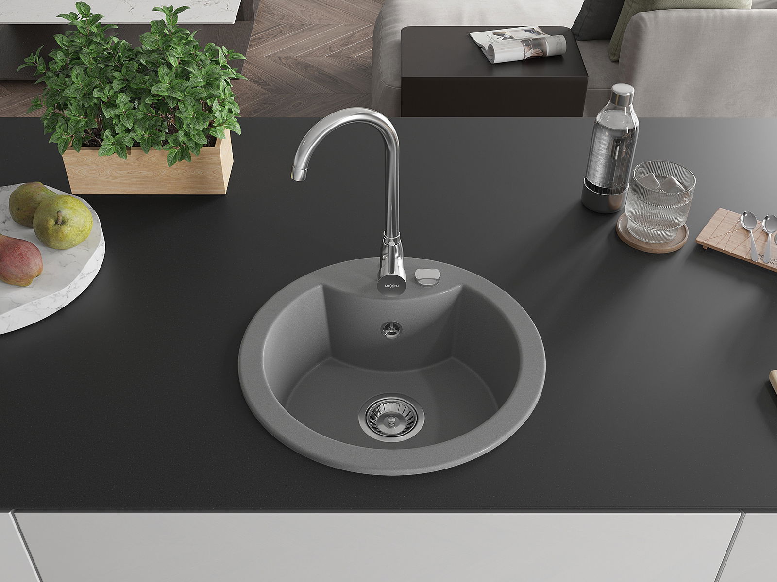Mexen Diego νεροχύτης γρανίτης 1-διαμερισμάτων 488 x 480 mm, γκρι, σιφόνι χρώμιο