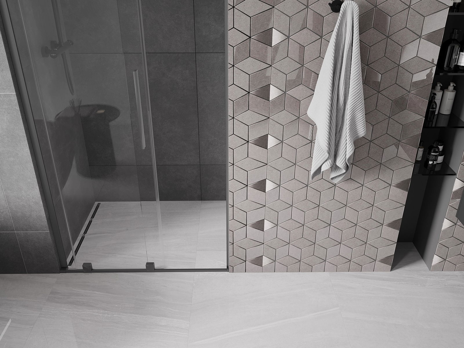 Η πρακτική και άνετη λαβή είναι κατασκευασμένη από ανοξείδωτο ατσάλι. Ο μοντέρνος σχεδιασμός σε συνδυασμό με το φινίρισμα που ταιριάζει με το χρώμα των προφίλ προσδίδει συνολικά μια σύγχρονη και στυλάτη εμφάνιση, υπογραμμίζοντας την αισθητική κάθε μπάνιου.