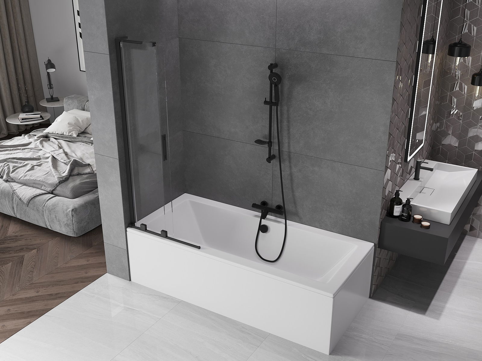 Mexen Velar L συρόμενη διπλή μπαριέρα μπανιέρας 75 x 150 cm, διαφανής, μαύρη