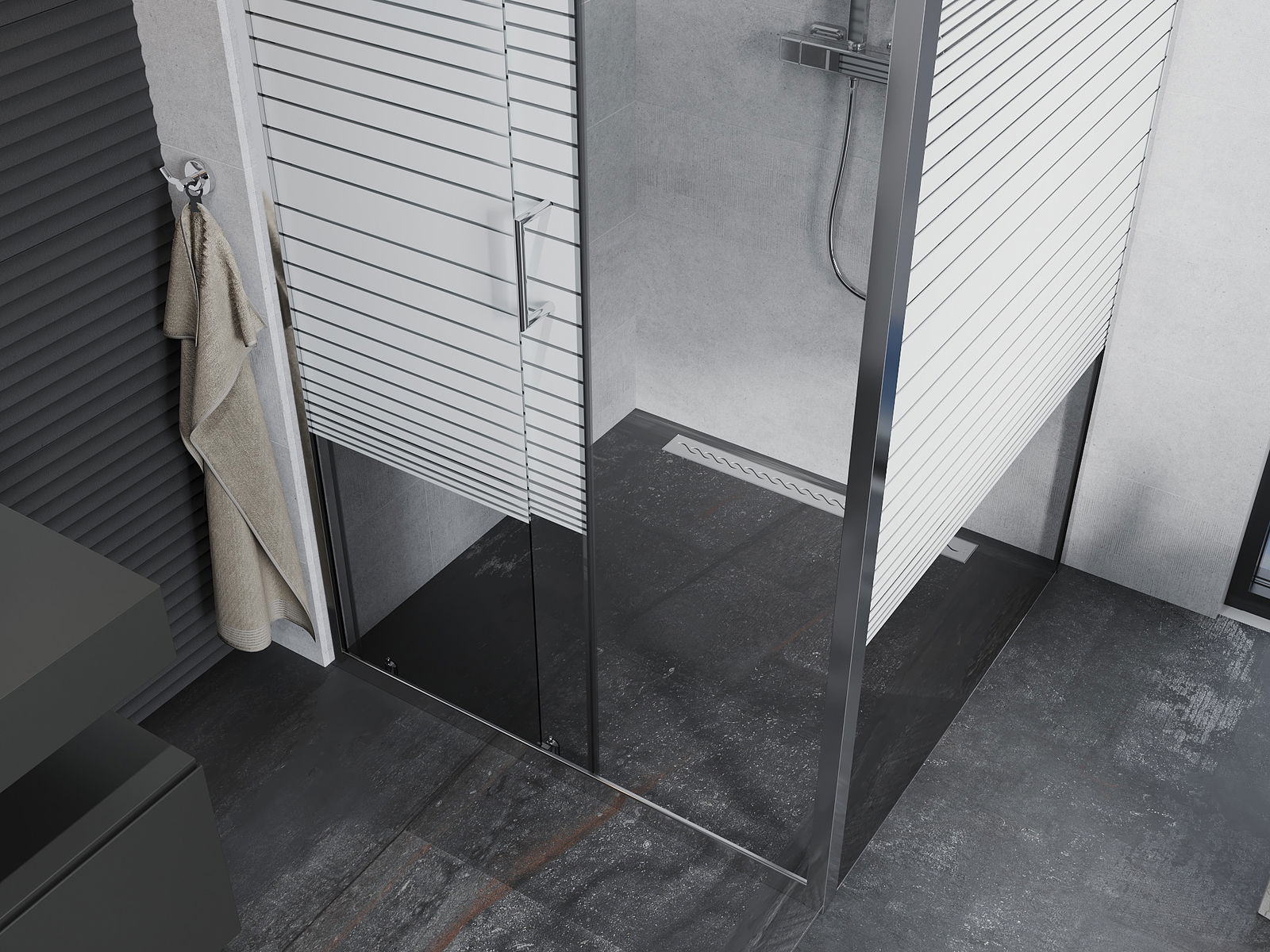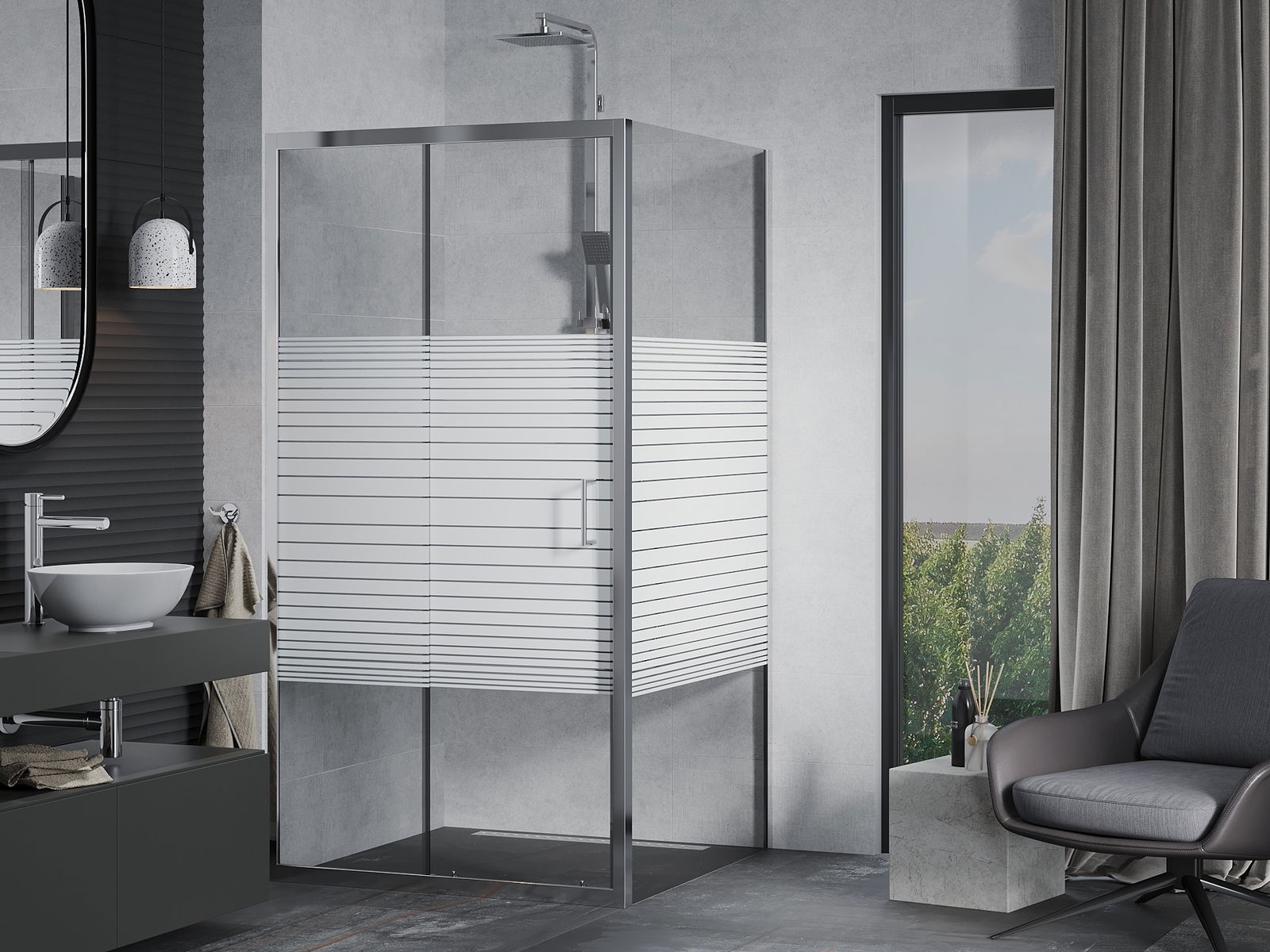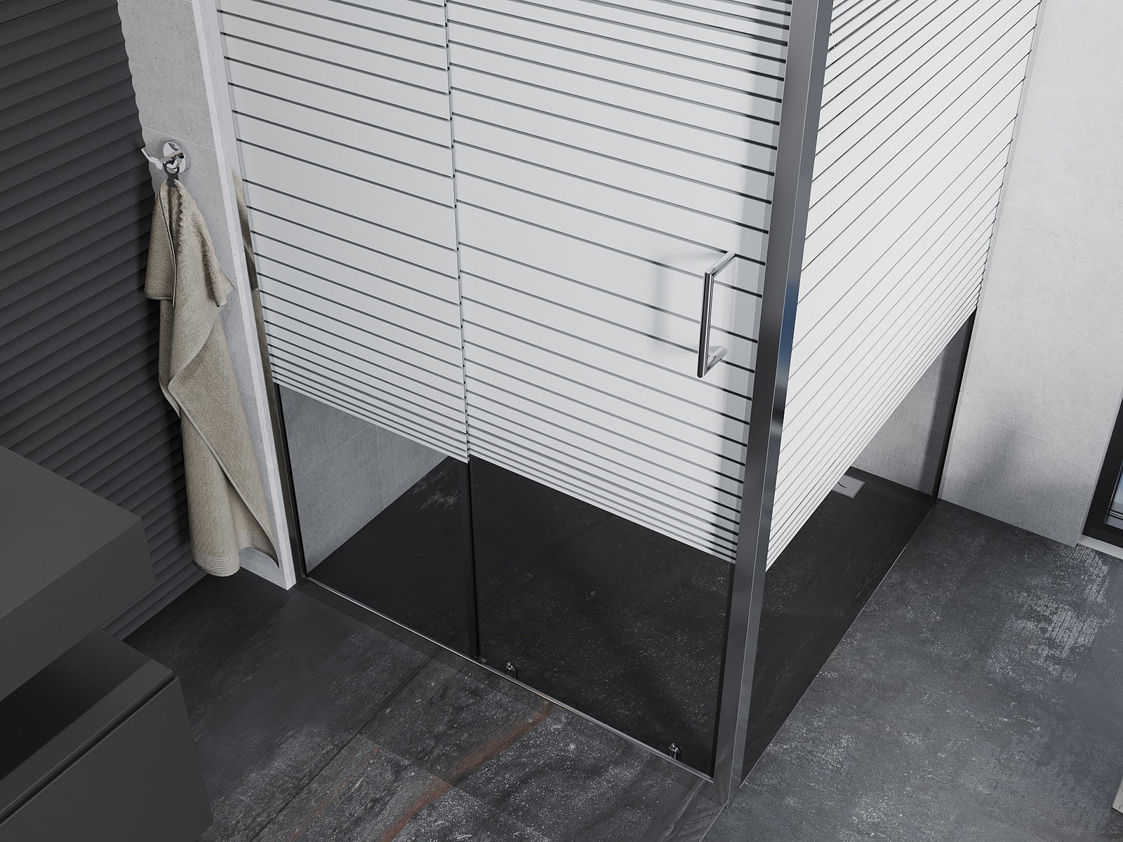 Η πρακτική και άνετη λαβή κατασκευάζεται από ανθεκτικό και αντοχής μέταλλο. Ο μοντέρνος σχεδιασμός σε συνδυασμό με το φινίρισμα που ταιριάζει με το χρώμα των προφίλ προσδίδει στο σύνολο μια σύγχρονη και κομψή εμφάνιση, τονίζοντας την αισθητική κάθε μπάνιου.