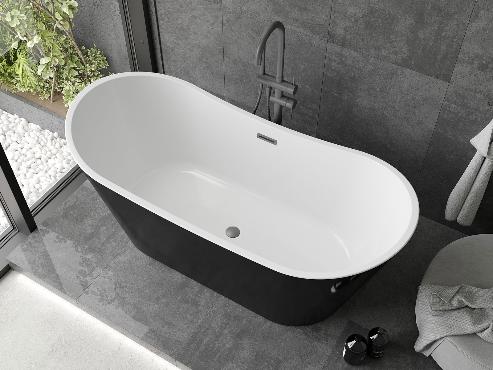 Η μπανιέρα ελεύθερης τοποθέτησης 150 x 75 cm είναι ιδανική επιλογή για σύγχρονα μπάνια. Κατασκευασμένη από ακρυλικό υγιεινής, προσφέρει ανθεκτικότητα και ευκολία στη συντήρηση της καθαριότητας. Το οβάλ σχήμα της και η γυαλιστερή επιφάνεια σε λευκό και μαύρο χρώμα συνδυάζονται τέλεια σε διάφορες διατάξεις. Πρόσθετα χαρακτηριστικά είναι η οπή υπερχείλισης και το εντυπωσιακό φινίρισμα σε χρώμα gun metal. Η μπανιέρα παρέχει άνεση στην τοποθέτηση ελεύθερης τοποθέτησης, καθιστώντας την όχι μόνο λειτουργικό αλλά και αισθητικό στοιχείο του μπάνιου.