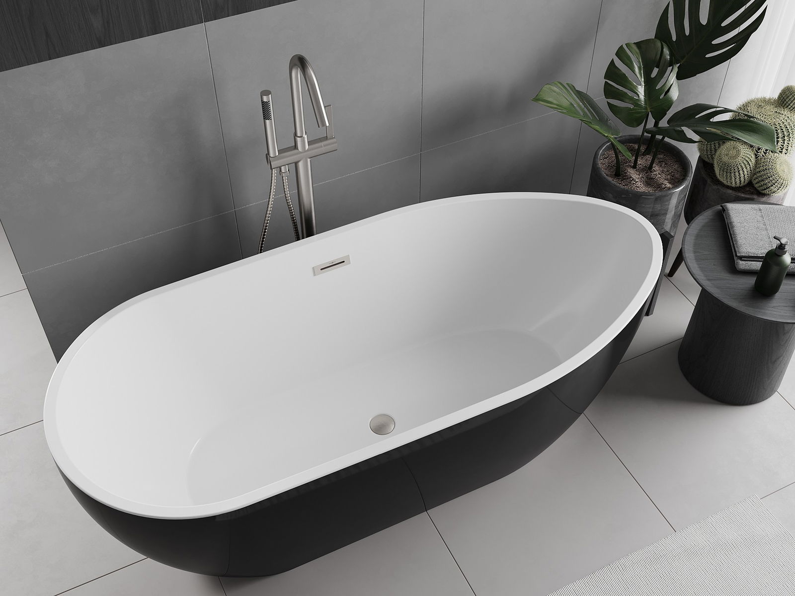 Η ελεύθερη μπανιέρα Mexen Eos διαστάσεων 170 x 75 cm συνδυάζει τη λειτουργικότητα με την κομψότητα. Είναι κατασκευασμένη από ακρυλικό υγειονομικής σημασίας και χαρακτηρίζεται από αντοχή στη ματαίωση και ακτινοβολία UV, που εξασφαλίζει διαρκή λάμψη. Το οβάλ σχήμα της, σε συνδυασμό με το λευκο-μαύρο φινίρισμα και την απόχρωση της επικάλυψης από νικέλιο βουρτσισμένο, προσθέτει μια σύγχρονη πινελιά σε κάθε μπάνιο. Ένα πρόσθετο πλεονέκτημα είναι το εγκατεστημένο σιφόν και το πώμα klik klak.