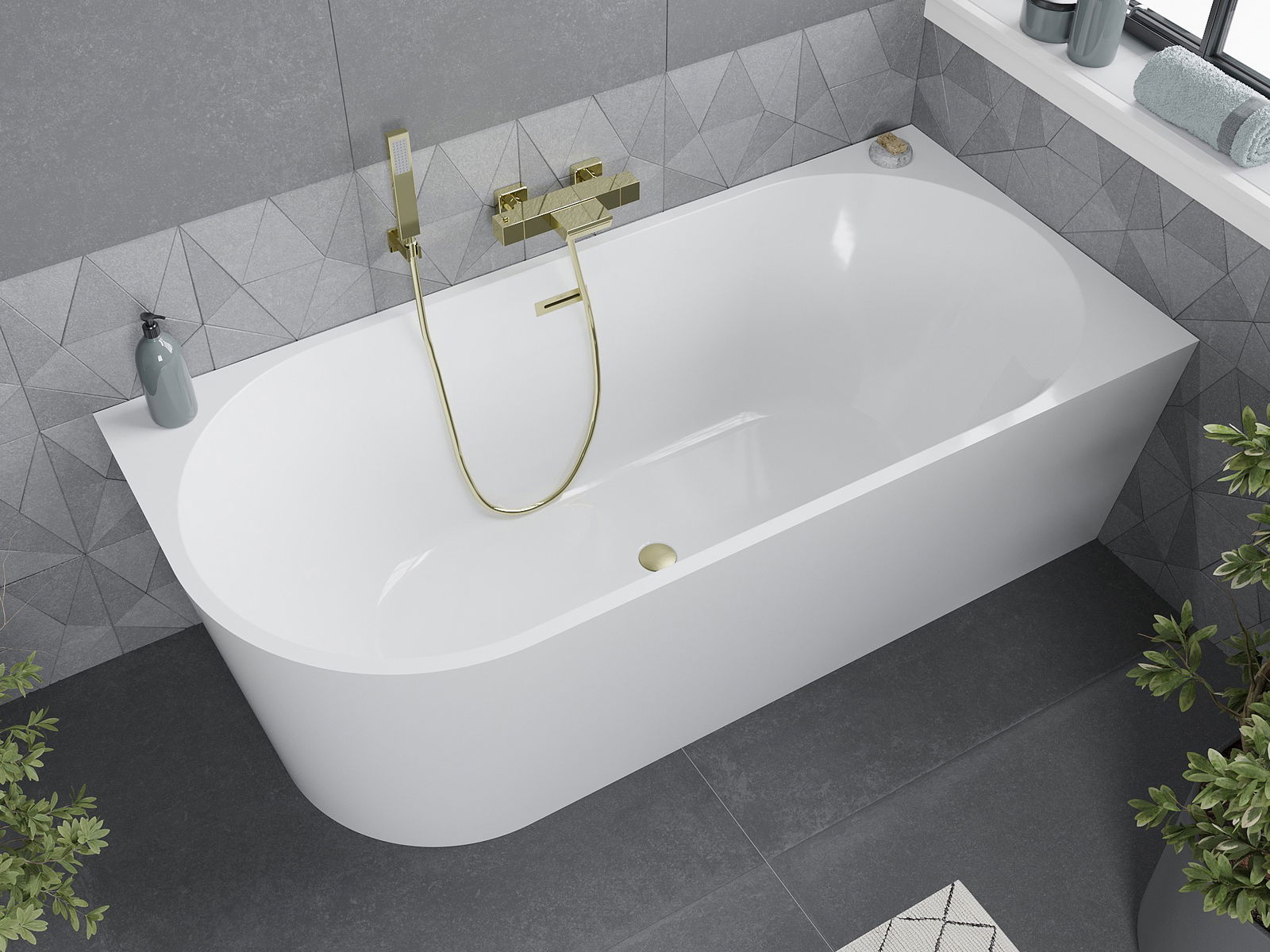 Η Mexen Mia είναι μια σύγχρονη ελεύθερη γωνιακή μπανιέρα με διαστάσεις 150 x 75 cm, κατασκευασμένη από υψηλής ποιότητας ακρυλικό υγειονομικής χρήσης. Χαρακτηρίζεται από το κομψό λευκό χρώμα της και το φινίρισμα σε χρυσή βουρτσισμένη, που της δίνει πολυτελή εμφάνιση. Με βάθος 45 cm και ύψος 58 cm, προσφέρει άνετη χαλάρωση. Η μπανιέρα διαθέτει οπή υπερχείλισης και είναι ανθεκτική στη ματ πόρωση και στις ακτίνες UV. Το σετ περιλαμβάνει σιφόνι και πώμα klik-klak, διευκολύνοντας την εγκατάσταση.