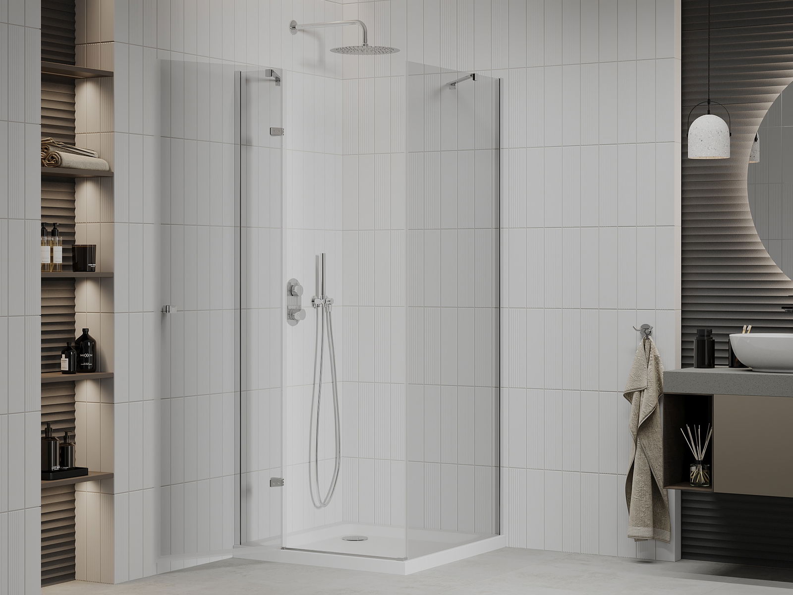 Χάρη στη χρήση ενός καθολικού συστήματος στήριξης, οι πόρτες ντους μπορούν να τοποθετηθούν είτε από τη δεξιά είτε από την αριστερή πλευρά, ανάλογα με τις ανάγκες. Έτσι μπορείτε να σχεδιάσετε με ευκολία ένα ντους προσαρμοσμένο στον χώρο του μπάνιου.