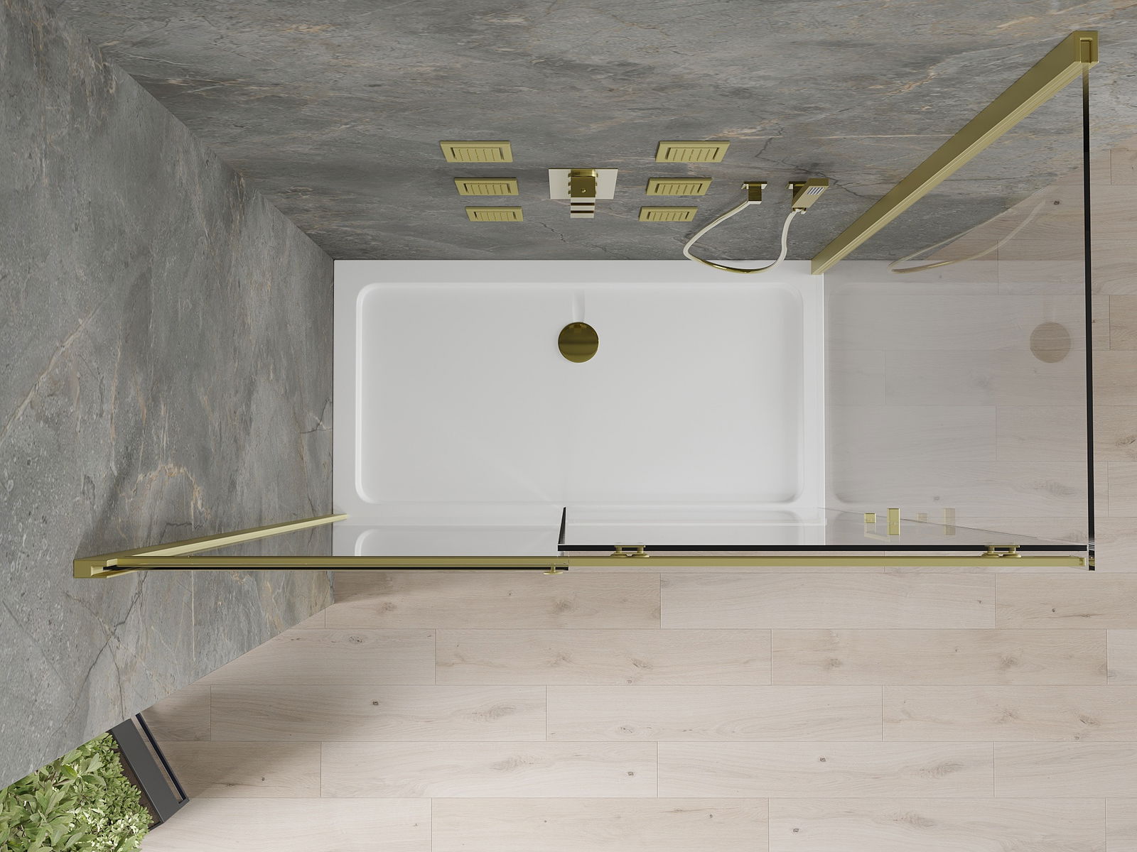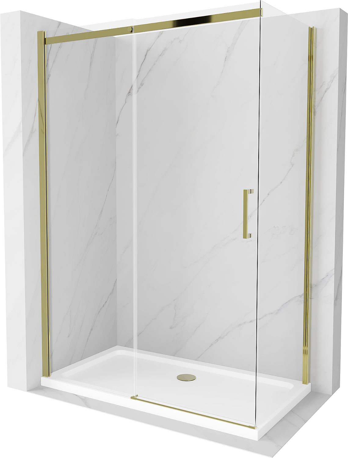 Mexen Omega συρόμενη καμπίνα ντους 130 x 70 cm, διαφανής, χρυσή + ντουζιέρα Flat