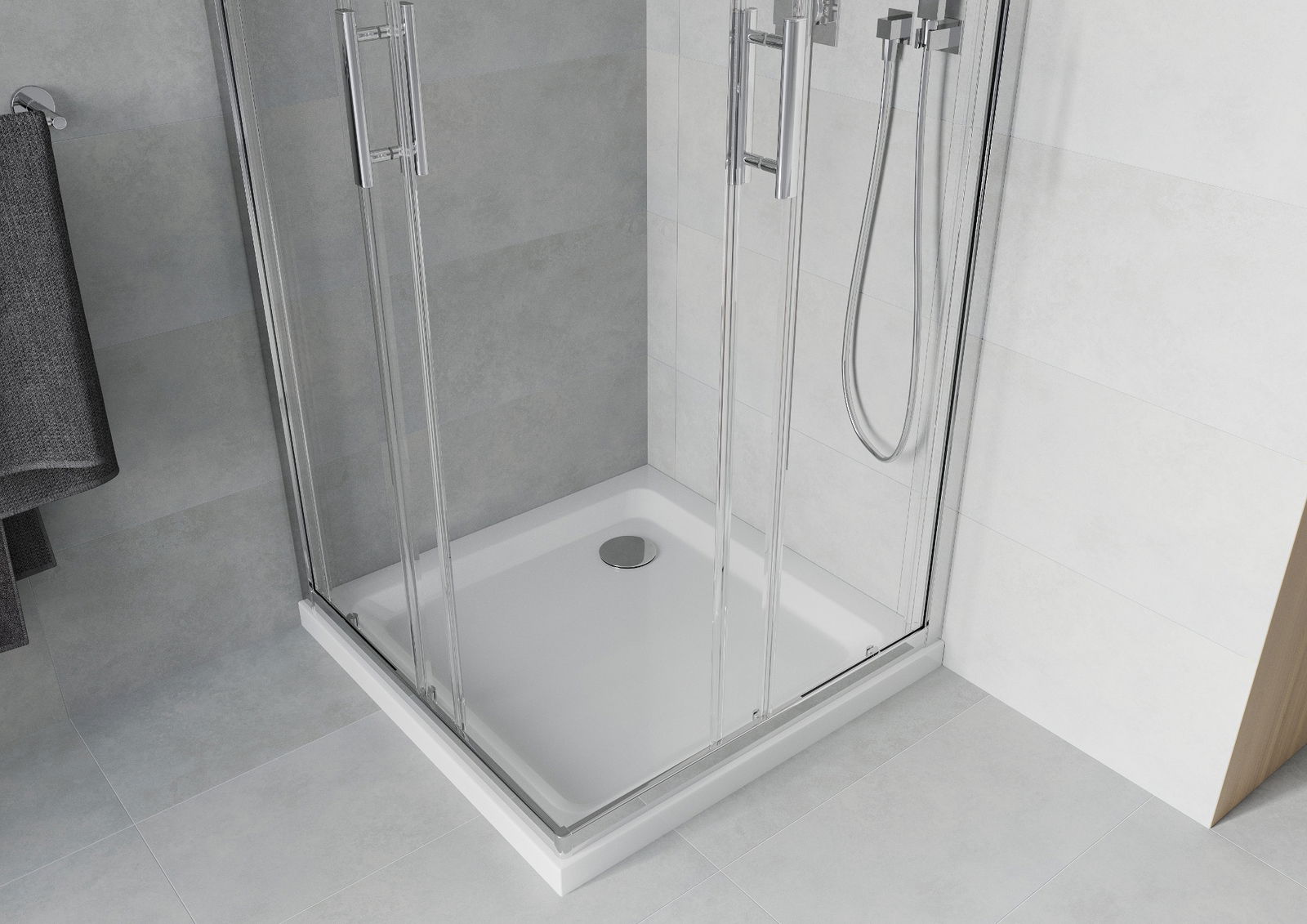 Η πρακτική και άνετη λαβή κατασκευάζεται από ανθεκτικό και αντοχής μέταλλο. Ο μοντέρνος σχεδιασμός σε συνδυασμό με το φινίρισμα που ταιριάζει με το χρώμα των προφίλ προσδίδει στο σύνολο μια σύγχρονη και κομψή εμφάνιση, τονίζοντας την αισθητική κάθε μπάνιου.