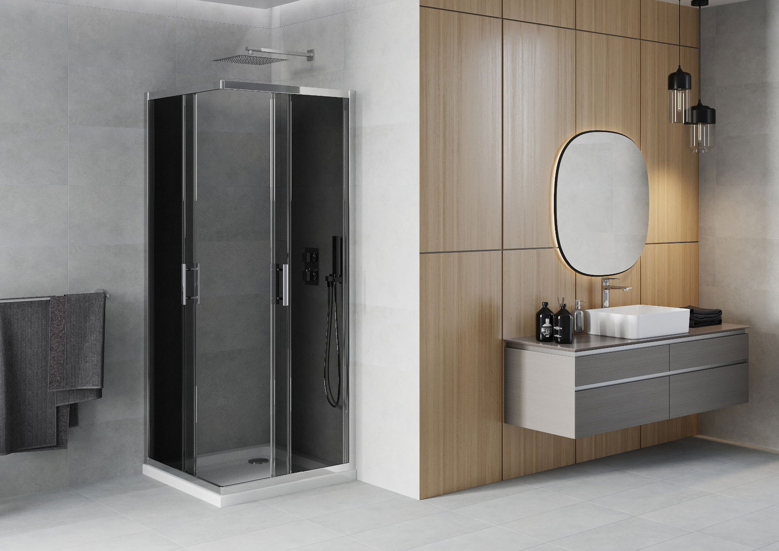 Η πρακτική και άνετη λαβή κατασκευάζεται από ανθεκτικό και αντοχής μέταλλο. Ο μοντέρνος σχεδιασμός σε συνδυασμό με το φινίρισμα που ταιριάζει με το χρώμα των προφίλ προσδίδει στο σύνολο μια σύγχρονη και κομψή εμφάνιση, τονίζοντας την αισθητική κάθε μπάνιου.