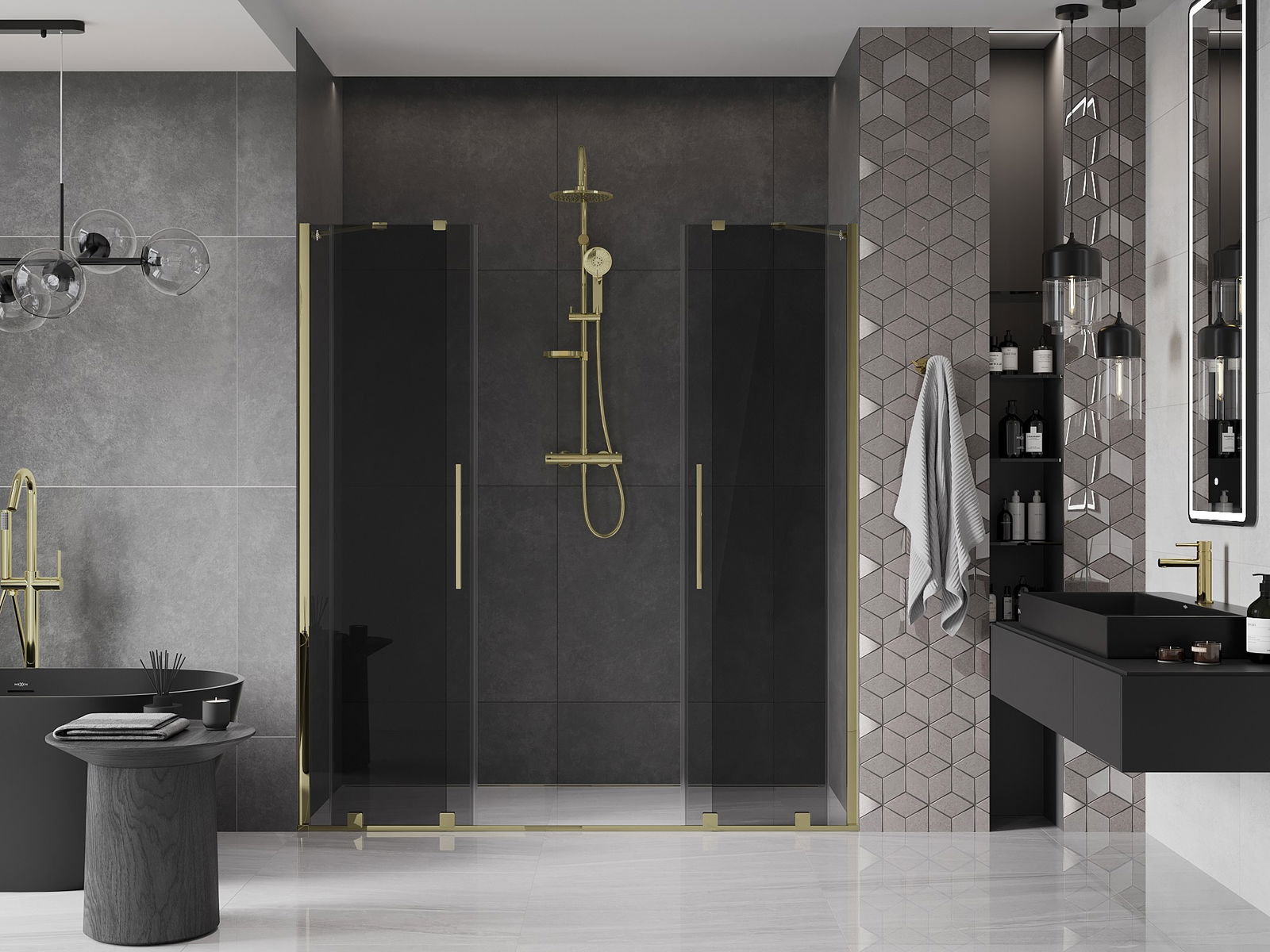 Mexen Velar Δίδυμες συρόμενες πόρτες ντους 170 cm, γραφίτης, χρυσό - 871-170-000-42-50
