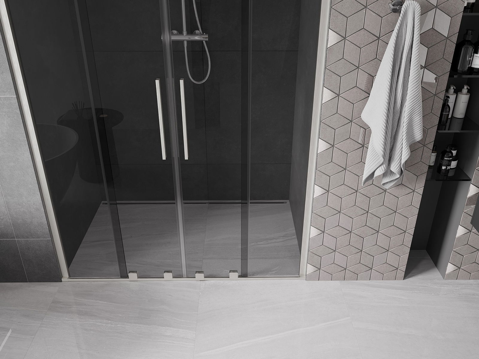 Η πρακτική και άνετη λαβή είναι κατασκευασμένη από ανοξείδωτο ατσάλι. Ο μοντέρνος σχεδιασμός σε συνδυασμό με το φινίρισμα που ταιριάζει με το χρώμα των προφίλ προσδίδει συνολικά μια σύγχρονη και στυλάτη εμφάνιση, υπογραμμίζοντας την αισθητική κάθε μπάνιου.