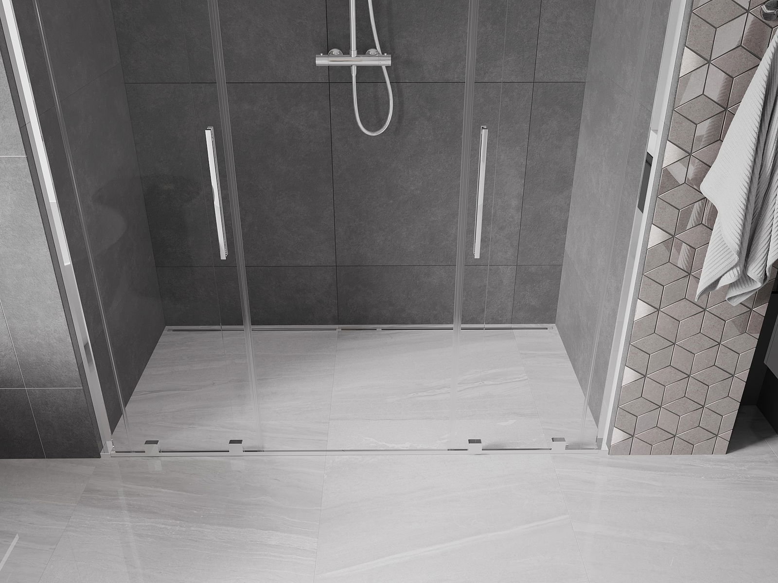 Η πρακτική και άνετη λαβή είναι κατασκευασμένη από ανοξείδωτο ατσάλι. Ο μοντέρνος σχεδιασμός σε συνδυασμό με το φινίρισμα που ταιριάζει με το χρώμα των προφίλ προσδίδει συνολικά μια σύγχρονη και στυλάτη εμφάνιση, υπογραμμίζοντας την αισθητική κάθε μπάνιου.