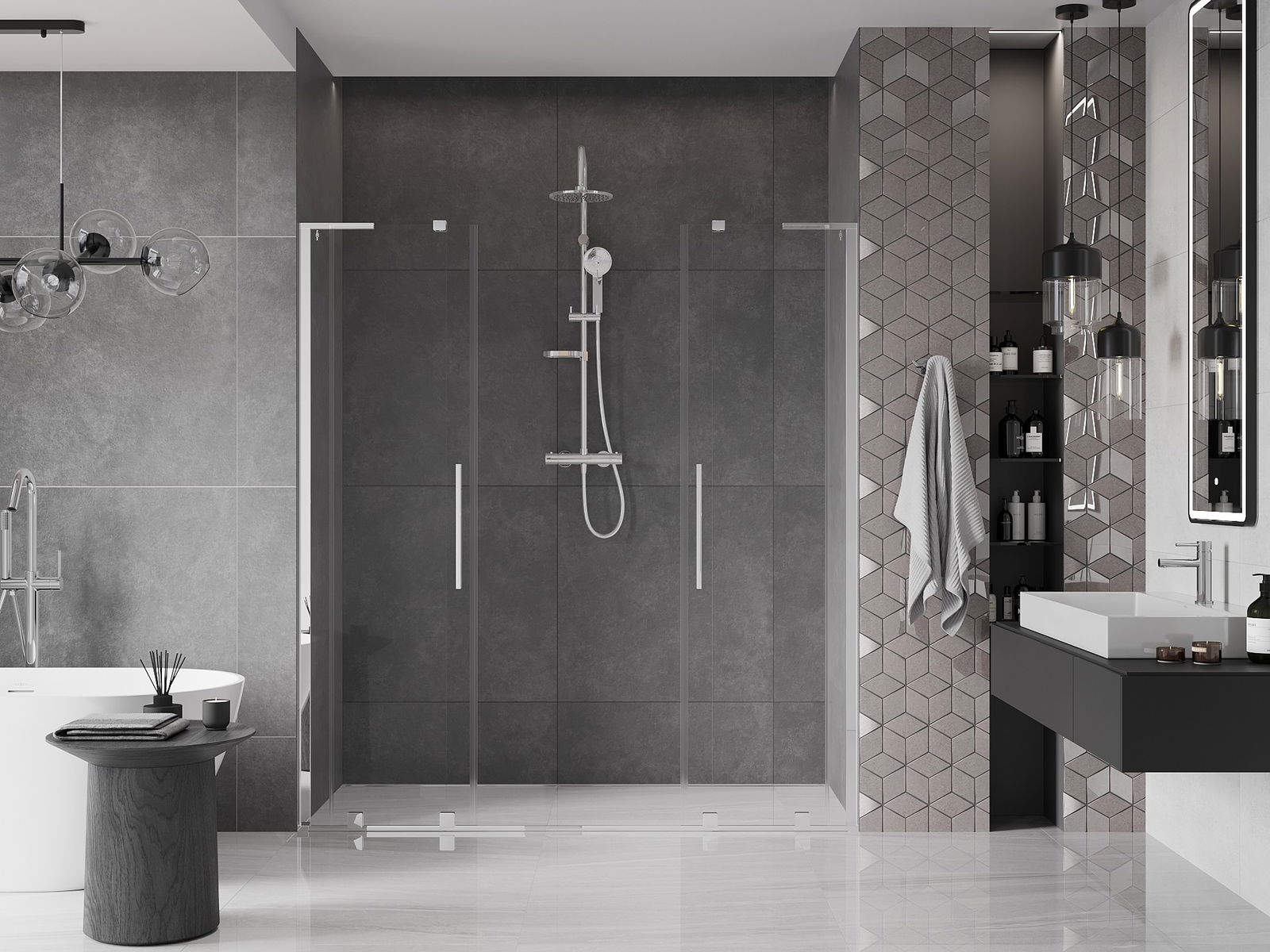 Χάρη στη χρήση ενός καθολικού συστήματος στήριξης, οι πόρτες ντους μπορούν να τοποθετηθούν είτε από τη δεξιά είτε από την αριστερή πλευρά, ανάλογα με τις ανάγκες. Έτσι μπορείτε να σχεδιάσετε με ευκολία ένα ντους προσαρμοσμένο στον χώρο του μπάνιου.