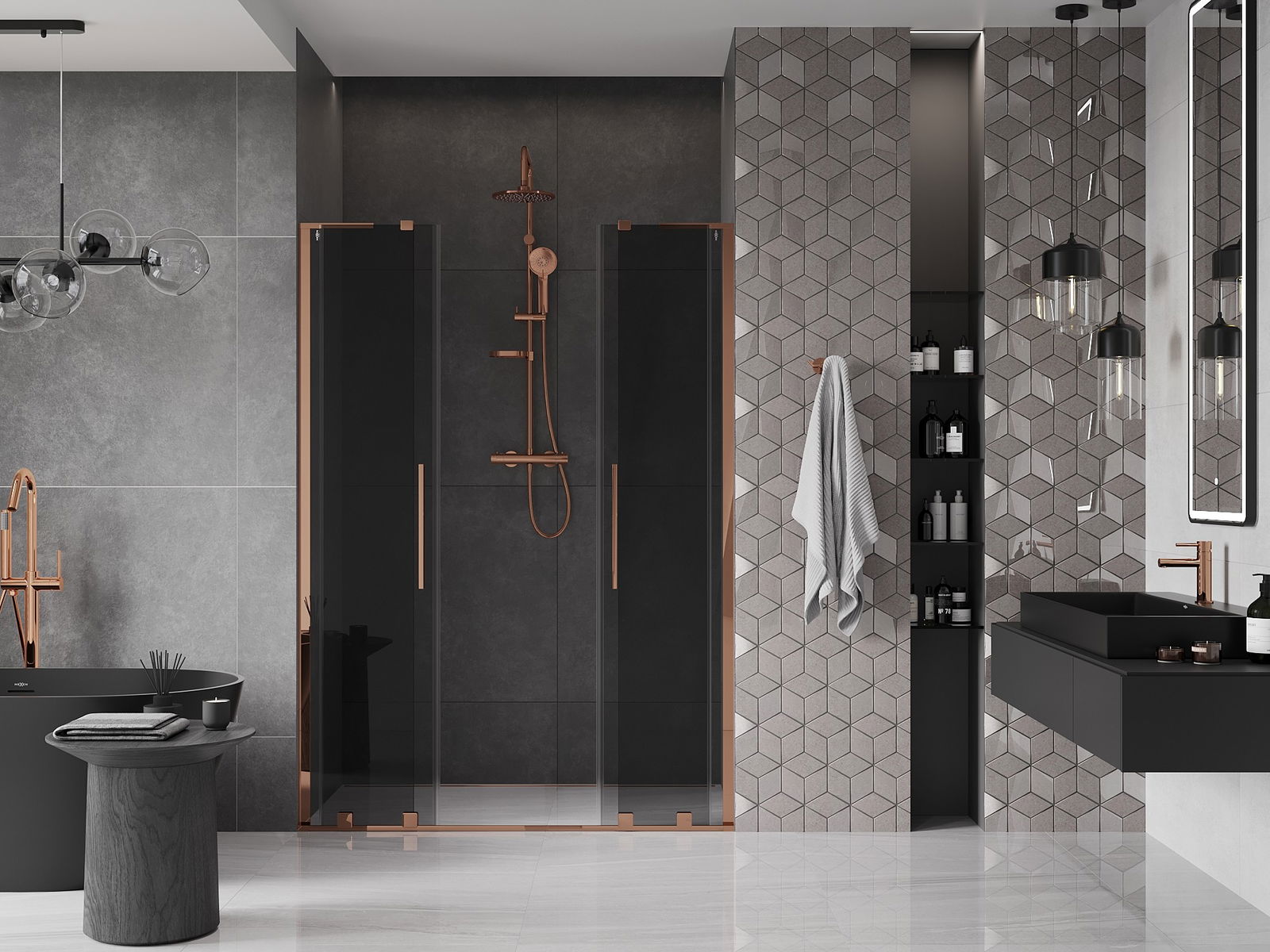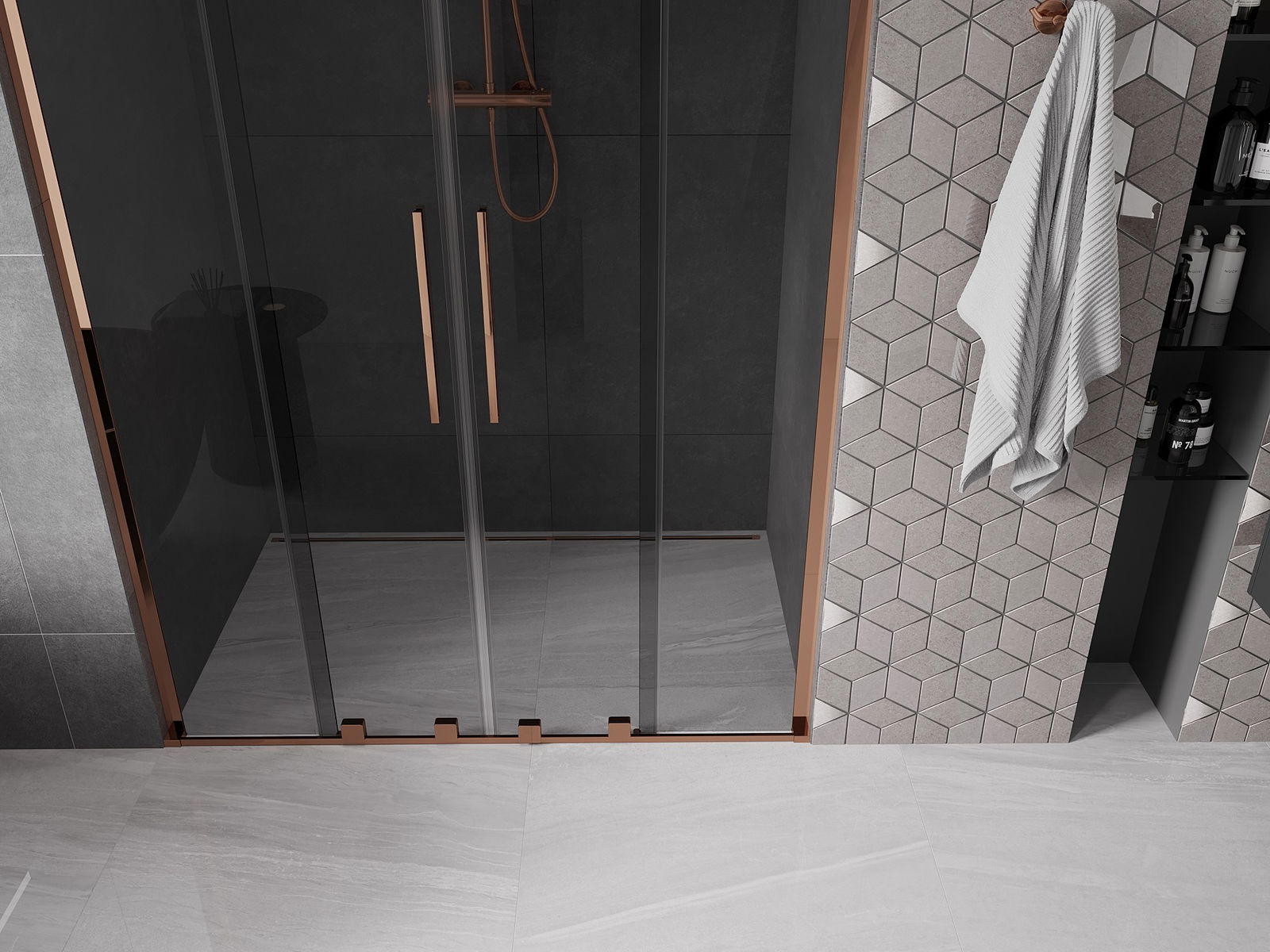 Mexen Velar L Duo συρόμενες πόρτες ντους 150 cm, γραφίτης, ροζ χρυσό - 871-150-003-42-60