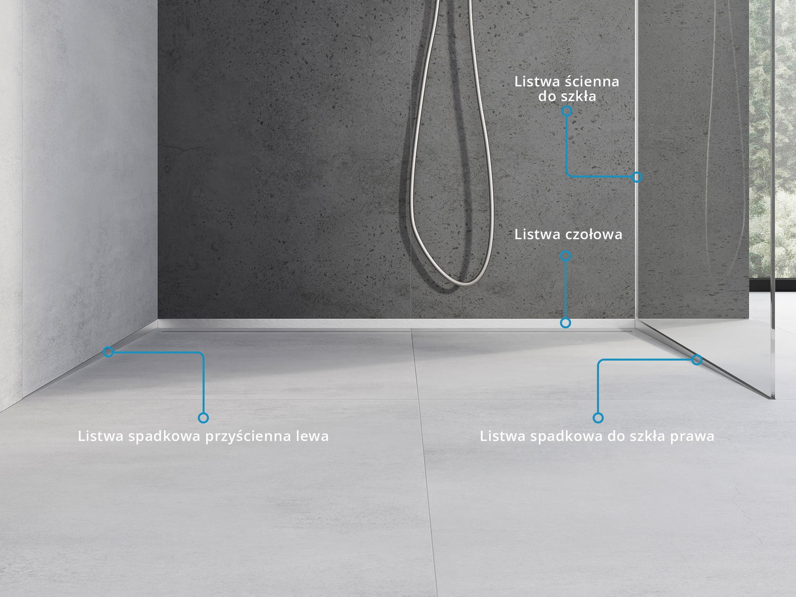 Η μετωπική λωρίδα συμπληρώνει τη χρήση κεκλιμένων λωρίδων, δημιουργώντας μια συνεκτική ολότητα στο χώρο του ντους