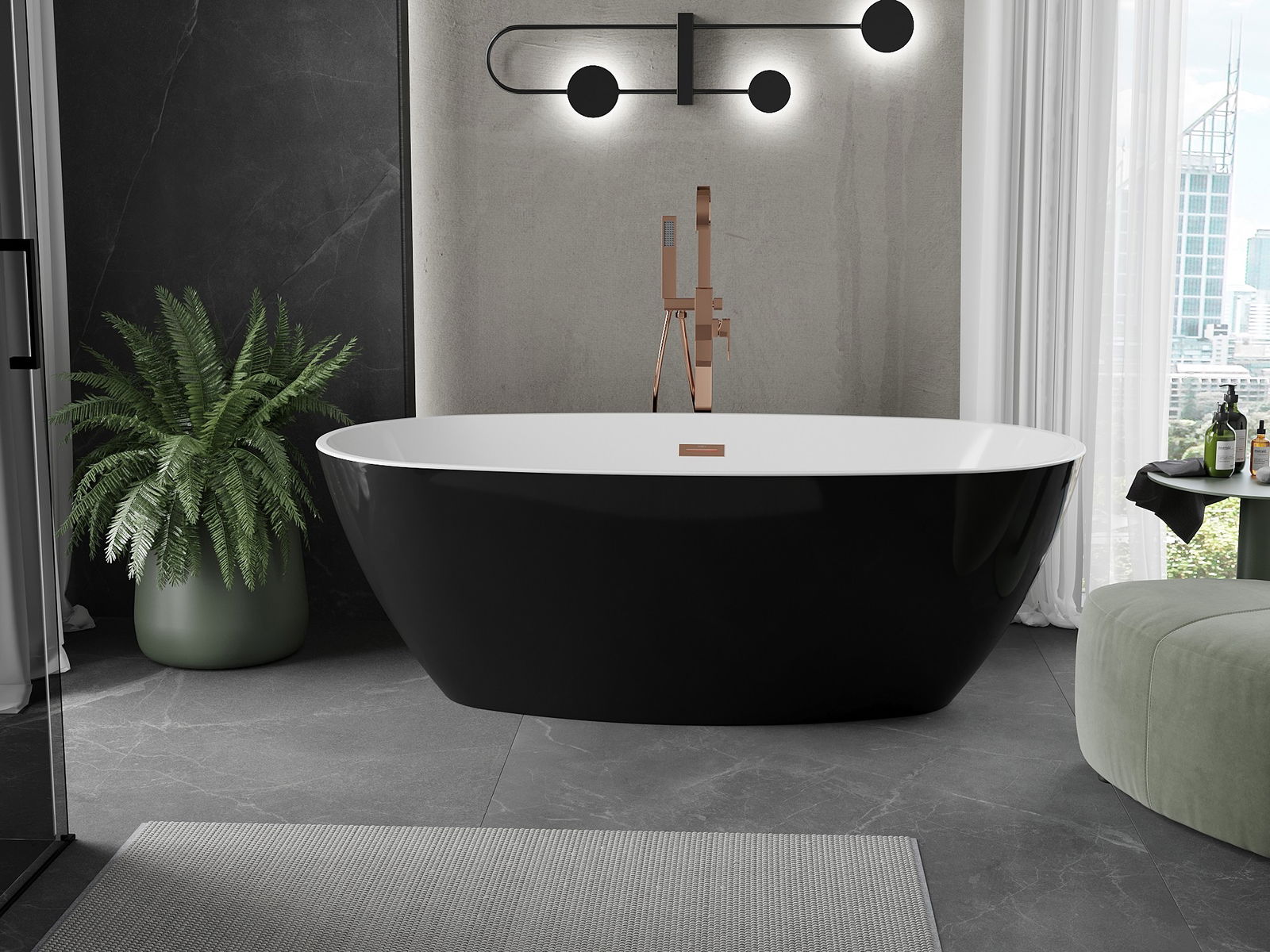 Η μπανιέρα ελεύθερης τοποθέτησης 180 x 95 cm είναι η ιδανική λύση για μοντέρνα μπάνια. Το οβάλ σχήμα της και η λαμπερή επιφάνεια σε λευκό-μαύρο χρώμα τονίζουν την κομψότητα του χώρου. Η υψηλή ποιότητα του ακρυλικού εγγυάται ανθεκτικότητα, ενώ το ροζ χρυσό στα στοιχεία φινιρίσματος προσθέτει μοναδική γοητεία. Το άνοιγμα υπερχείλισης και η κεντρική αποχέτευση αυξάνουν τη λειτουργικότητα. Η μπανιέρα είναι ανθεκτική στη θολότητα και την ακτινοβολία UV, διατηρώντας την όμορφη εμφάνιση της για μεγάλο χρονικό διάστημα.