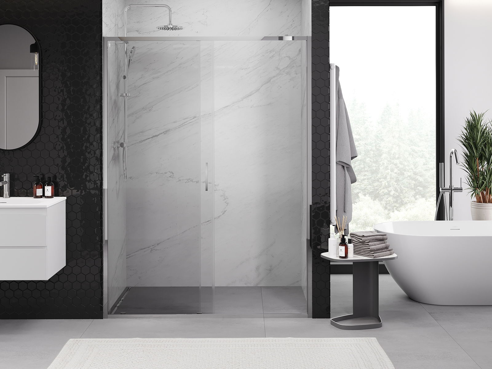 Χάρη στη χρήση ενός καθολικού συστήματος στήριξης, οι πόρτες ντους μπορούν να τοποθετηθούν είτε από τη δεξιά είτε από την αριστερή πλευρά, ανάλογα με τις ανάγκες. Έτσι μπορείτε να σχεδιάσετε με ευκολία ένα ντους προσαρμοσμένο στον χώρο του μπάνιου.