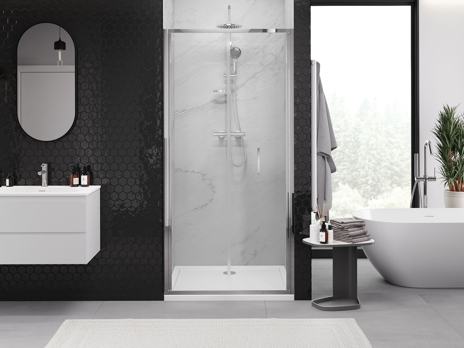 Χάρη στη χρήση ενός καθολικού συστήματος στήριξης, οι πόρτες ντους μπορούν να τοποθετηθούν είτε από τη δεξιά είτε από την αριστερή πλευρά, ανάλογα με τις ανάγκες. Έτσι μπορείτε να σχεδιάσετε με ευκολία ένα ντους προσαρμοσμένο στον χώρο του μπάνιου.