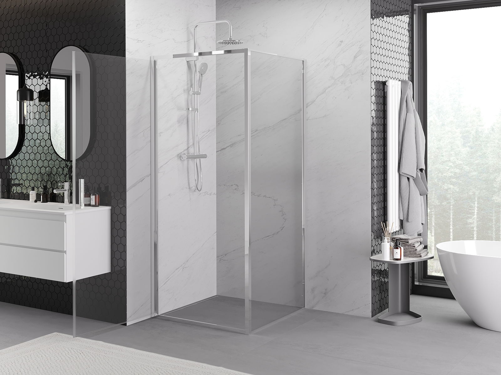 Χάρη στη χρήση ενός καθολικού συστήματος στήριξης, οι πόρτες ντους μπορούν να τοποθετηθούν είτε από τη δεξιά είτε από την αριστερή πλευρά, ανάλογα με τις ανάγκες. Έτσι μπορείτε να σχεδιάσετε με ευκολία ένα ντους προσαρμοσμένο στον χώρο του μπάνιου.