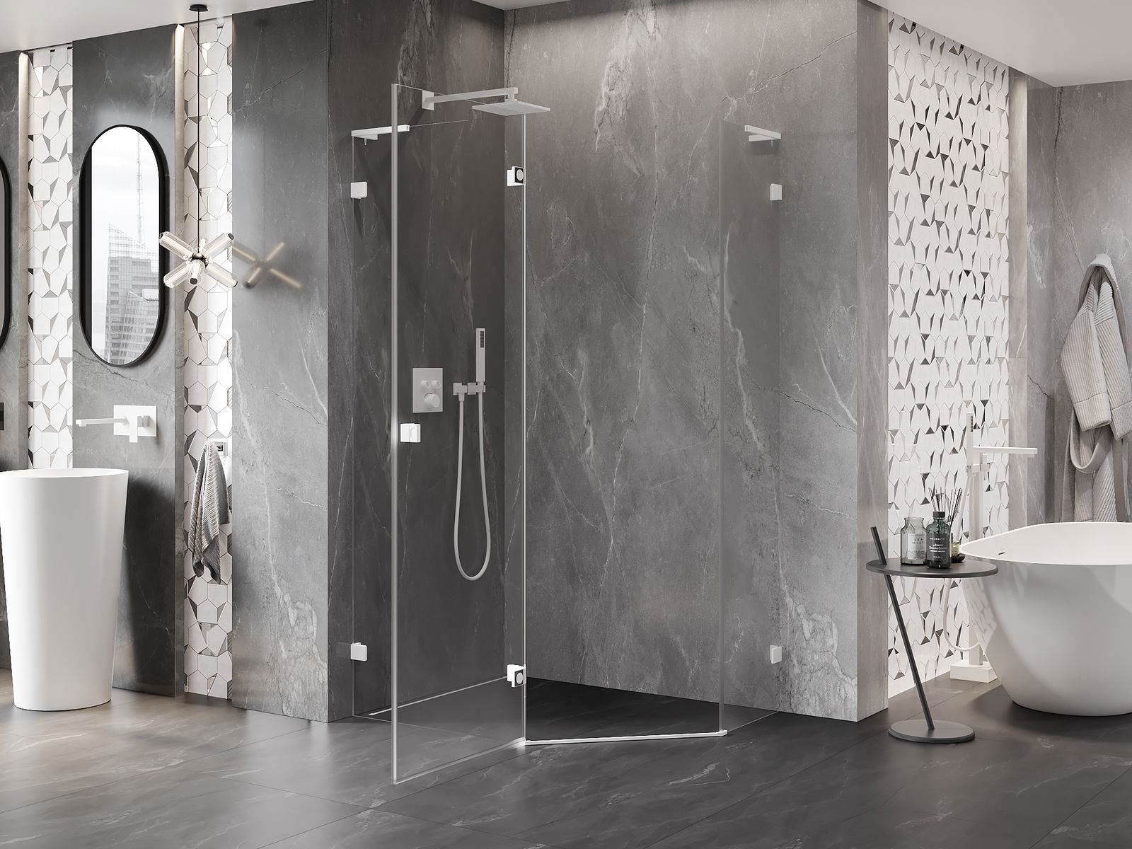 Οι σφιγκτήρες και οι μεντεσέδες είναι κατασκευασμένοι από πολύ ανθεκτικό ορείχαλκο και επιπλέον δημιουργούν μια ευθυγραμμισμένη επιφάνεια γυαλιού. Είναι μια εξαιρετική επιλογή που συνδυάζει κομψότητα, ανθεκτικότητα και σύγχρονο σχεδιασμό. Χάρη σε αυτές τις λύσεις, η ντουζιέρα κερδίζει σε αισθητική και ταυτόχρονα διευκολύνουν τη διατήρηση της καθαριότητας.