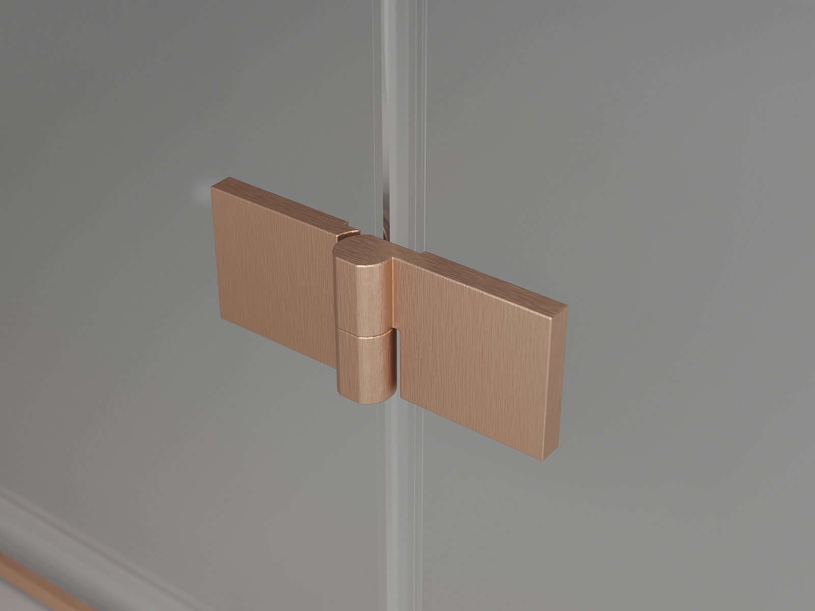 Οι σφιγκτήρες και οι μεντεσέδες είναι κατασκευασμένοι από πολύ ανθεκτικό ορείχαλκο και επιπλέον δημιουργούν μια ευθυγραμμισμένη επιφάνεια γυαλιού. Είναι μια εξαιρετική επιλογή που συνδυάζει κομψότητα, ανθεκτικότητα και σύγχρονο σχεδιασμό. Χάρη σε αυτές τις λύσεις, η ντουζιέρα κερδίζει σε αισθητική και ταυτόχρονα διευκολύνουν τη διατήρηση της καθαριότητας.