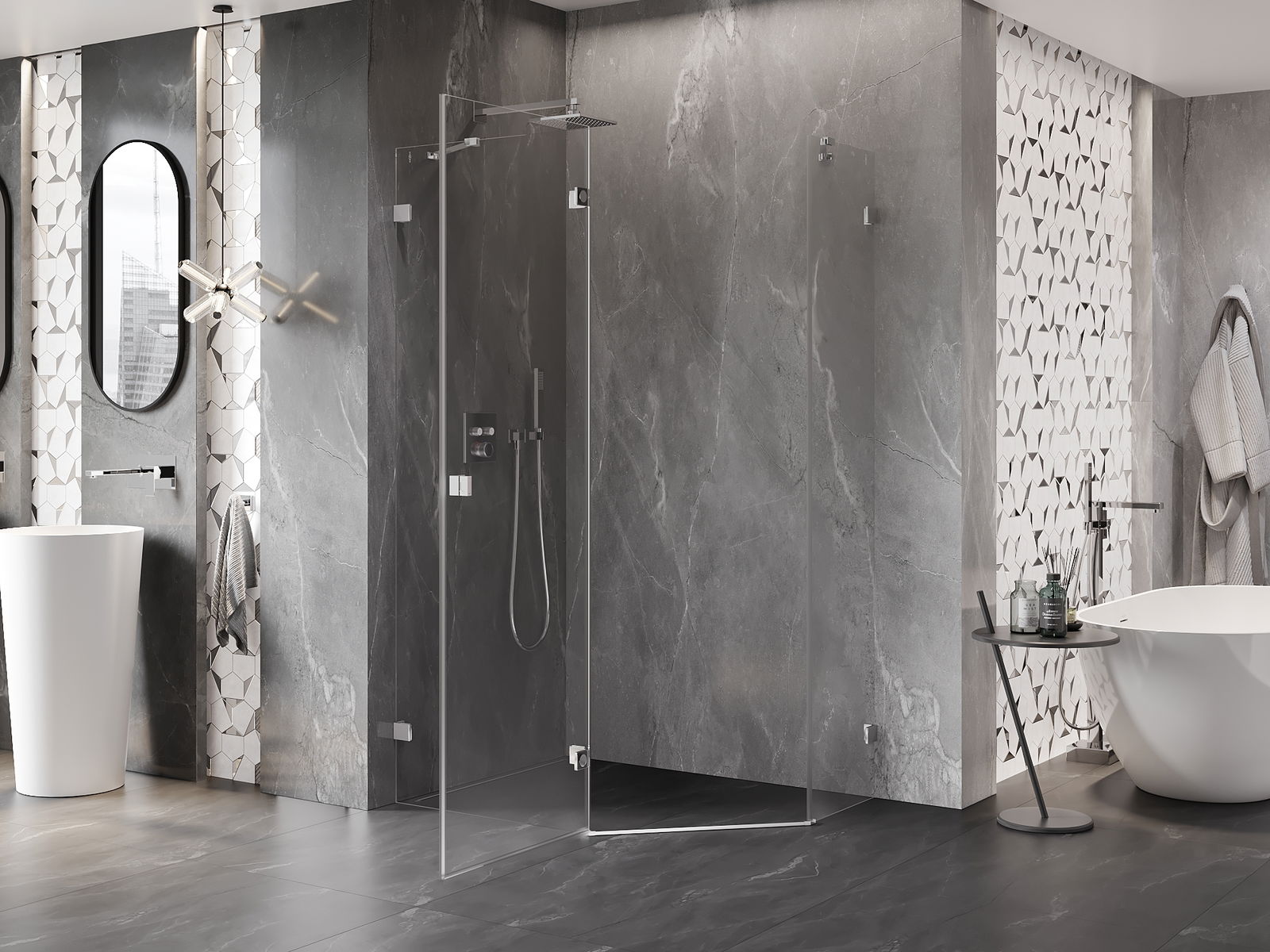 Οι σφιγκτήρες και οι μεντεσέδες είναι κατασκευασμένοι από πολύ ανθεκτικό ορείχαλκο και επιπλέον δημιουργούν μια ευθυγραμμισμένη επιφάνεια γυαλιού. Είναι μια εξαιρετική επιλογή που συνδυάζει κομψότητα, ανθεκτικότητα και σύγχρονο σχεδιασμό. Χάρη σε αυτές τις λύσεις, η ντουζιέρα κερδίζει σε αισθητική και ταυτόχρονα διευκολύνουν τη διατήρηση της καθαριότητας.