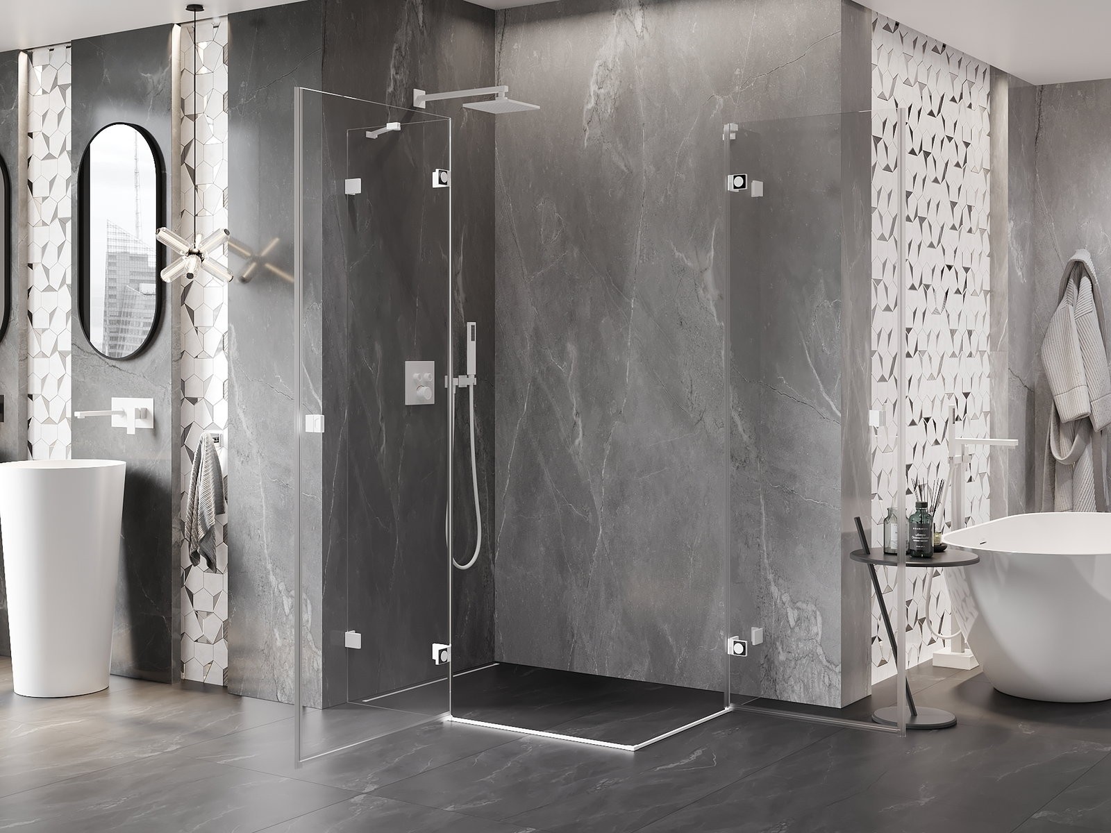 Οι σφιγκτήρες και οι μεντεσέδες είναι κατασκευασμένοι από πολύ ανθεκτικό ορείχαλκο και επιπλέον δημιουργούν μια ευθυγραμμισμένη επιφάνεια γυαλιού. Είναι μια εξαιρετική επιλογή που συνδυάζει κομψότητα, ανθεκτικότητα και σύγχρονο σχεδιασμό. Χάρη σε αυτές τις λύσεις, η ντουζιέρα κερδίζει σε αισθητική και ταυτόχρονα διευκολύνουν τη διατήρηση της καθαριότητας.