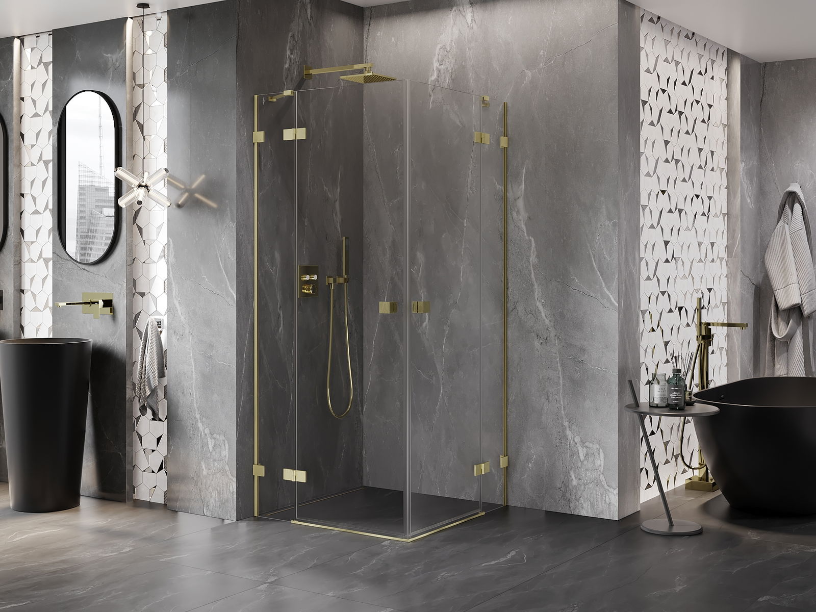 Οι σφιγκτήρες και οι μεντεσέδες είναι κατασκευασμένοι από πολύ ανθεκτικό ορείχαλκο και επιπλέον δημιουργούν μια ευθυγραμμισμένη επιφάνεια γυαλιού. Είναι μια εξαιρετική επιλογή που συνδυάζει κομψότητα, ανθεκτικότητα και σύγχρονο σχεδιασμό. Χάρη σε αυτές τις λύσεις, η ντουζιέρα κερδίζει σε αισθητική και ταυτόχρονα διευκολύνουν τη διατήρηση της καθαριότητας.
