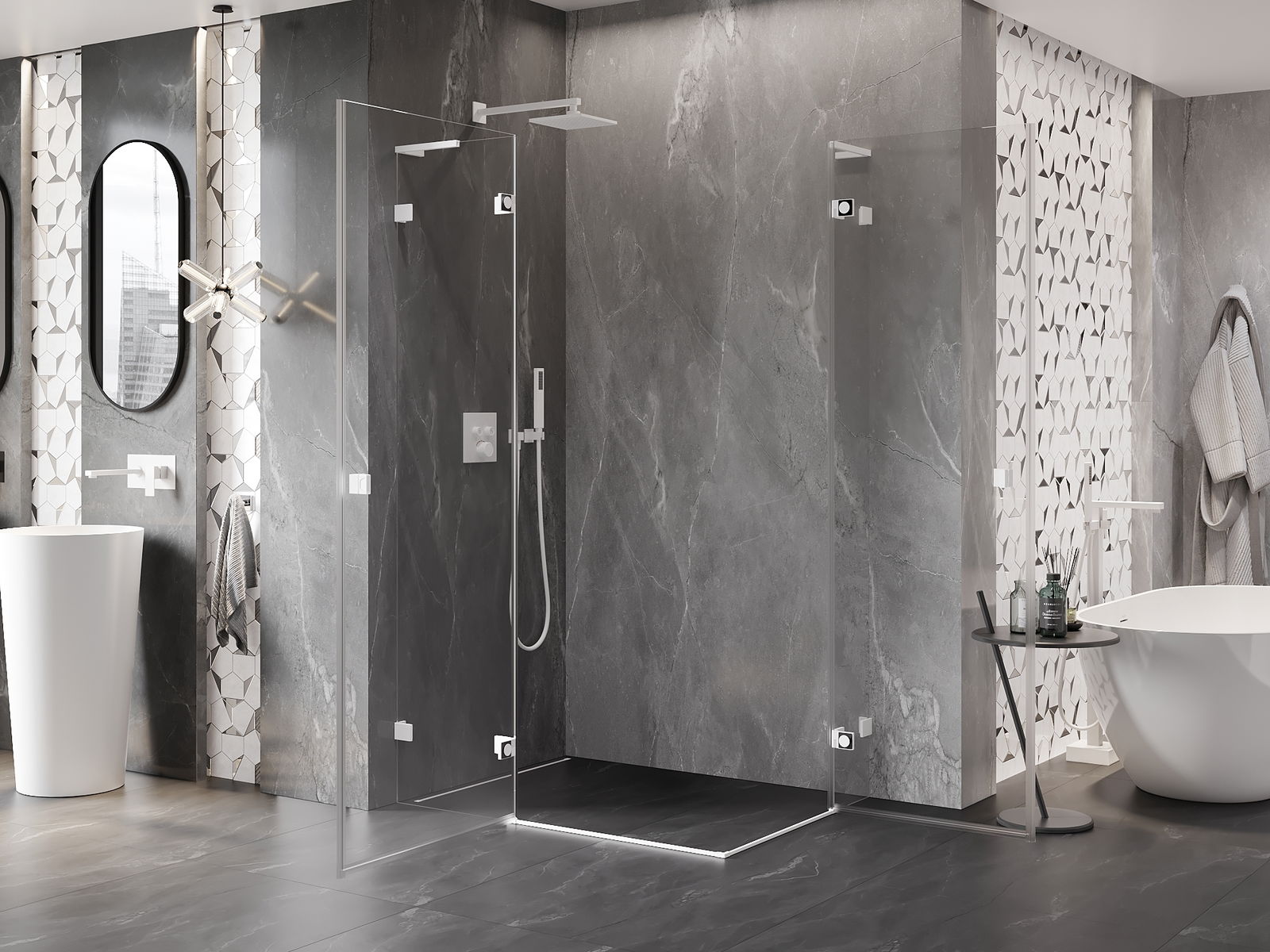 Οι σφιγκτήρες και οι μεντεσέδες είναι κατασκευασμένοι από πολύ ανθεκτικό ορείχαλκο και επιπλέον δημιουργούν μια ευθυγραμμισμένη επιφάνεια γυαλιού. Είναι μια εξαιρετική επιλογή που συνδυάζει κομψότητα, ανθεκτικότητα και σύγχρονο σχεδιασμό. Χάρη σε αυτές τις λύσεις, η ντουζιέρα κερδίζει σε αισθητική και ταυτόχρονα διευκολύνουν τη διατήρηση της καθαριότητας.