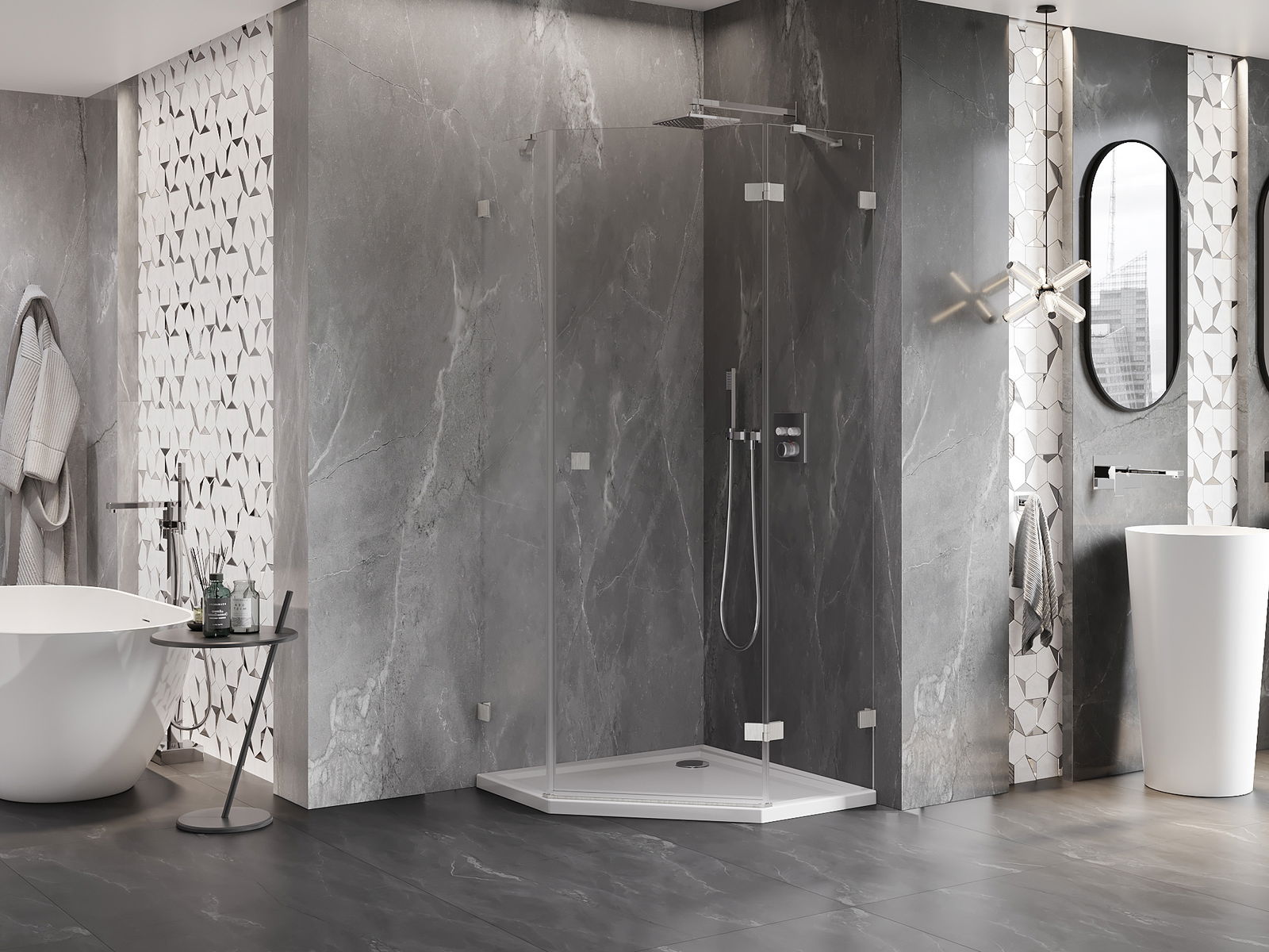 Mexen Lunar πεντάγωνη καμπίνα ντους ανακλινόμενη δεξιά 80 x 80 cm, διάφανη,
