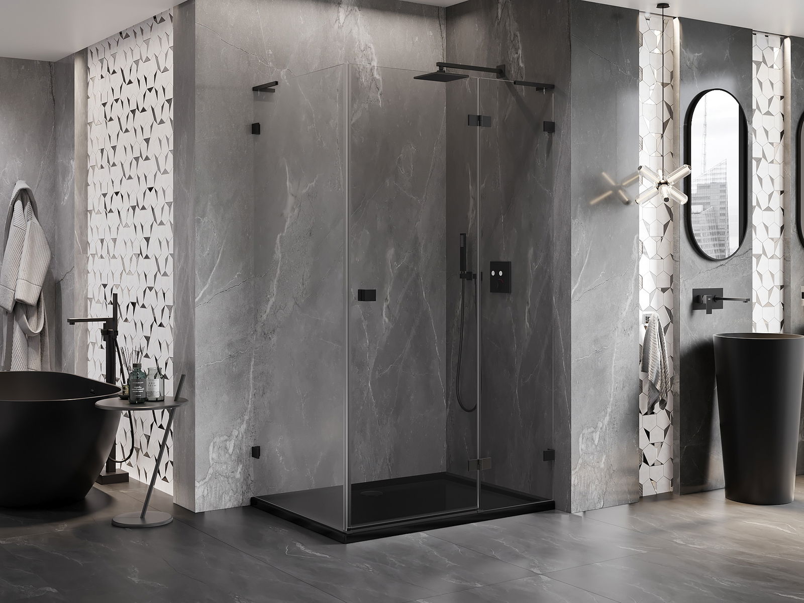 Οι σφιγκτήρες και οι μεντεσέδες είναι κατασκευασμένοι από πολύ ανθεκτικό ορείχαλκο και επιπλέον δημιουργούν μια ευθυγραμμισμένη επιφάνεια γυαλιού. Είναι μια εξαιρετική επιλογή που συνδυάζει κομψότητα, ανθεκτικότητα και σύγχρονο σχεδιασμό. Χάρη σε αυτές τις λύσεις, η ντουζιέρα κερδίζει σε αισθητική και ταυτόχρονα διευκολύνουν τη διατήρηση της καθαριότητας.