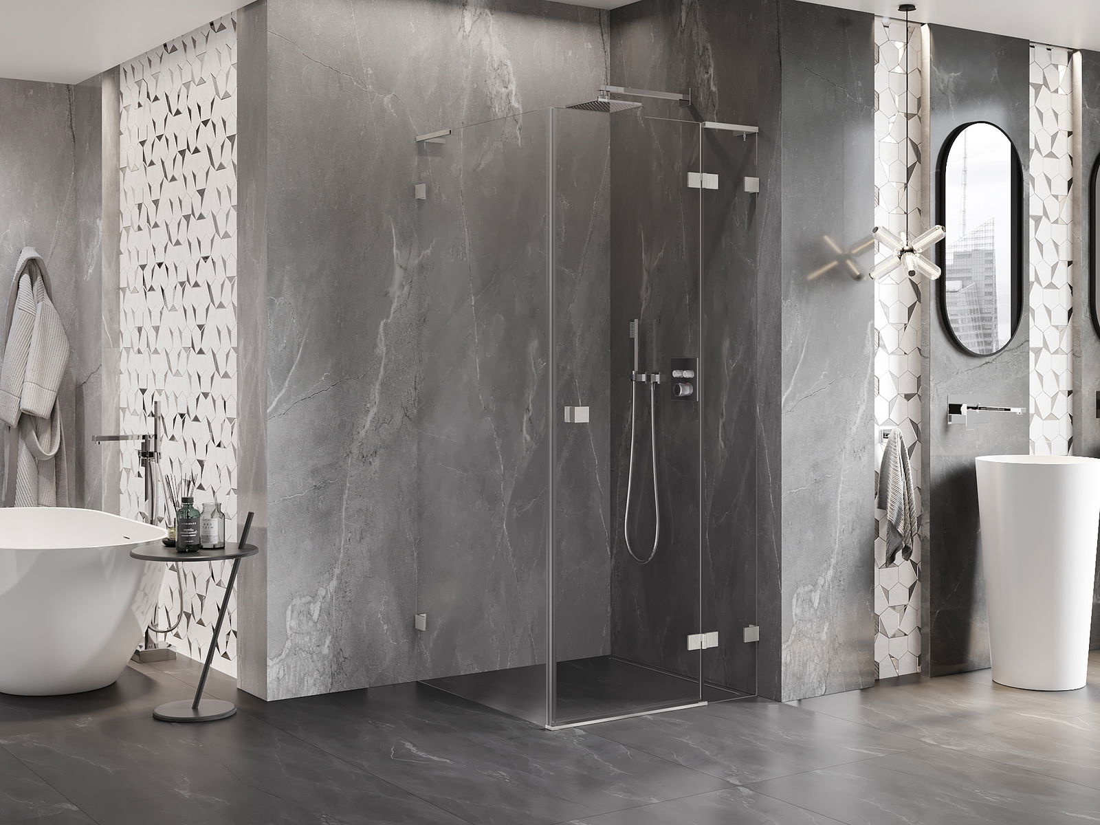 Οι σφιγκτήρες και οι μεντεσέδες είναι κατασκευασμένοι από πολύ ανθεκτικό ορείχαλκο και επιπλέον δημιουργούν μια ευθυγραμμισμένη επιφάνεια γυαλιού. Είναι μια εξαιρετική επιλογή που συνδυάζει κομψότητα, ανθεκτικότητα και σύγχρονο σχεδιασμό. Χάρη σε αυτές τις λύσεις, η ντουζιέρα κερδίζει σε αισθητική και ταυτόχρονα διευκολύνουν τη διατήρηση της καθαριότητας.