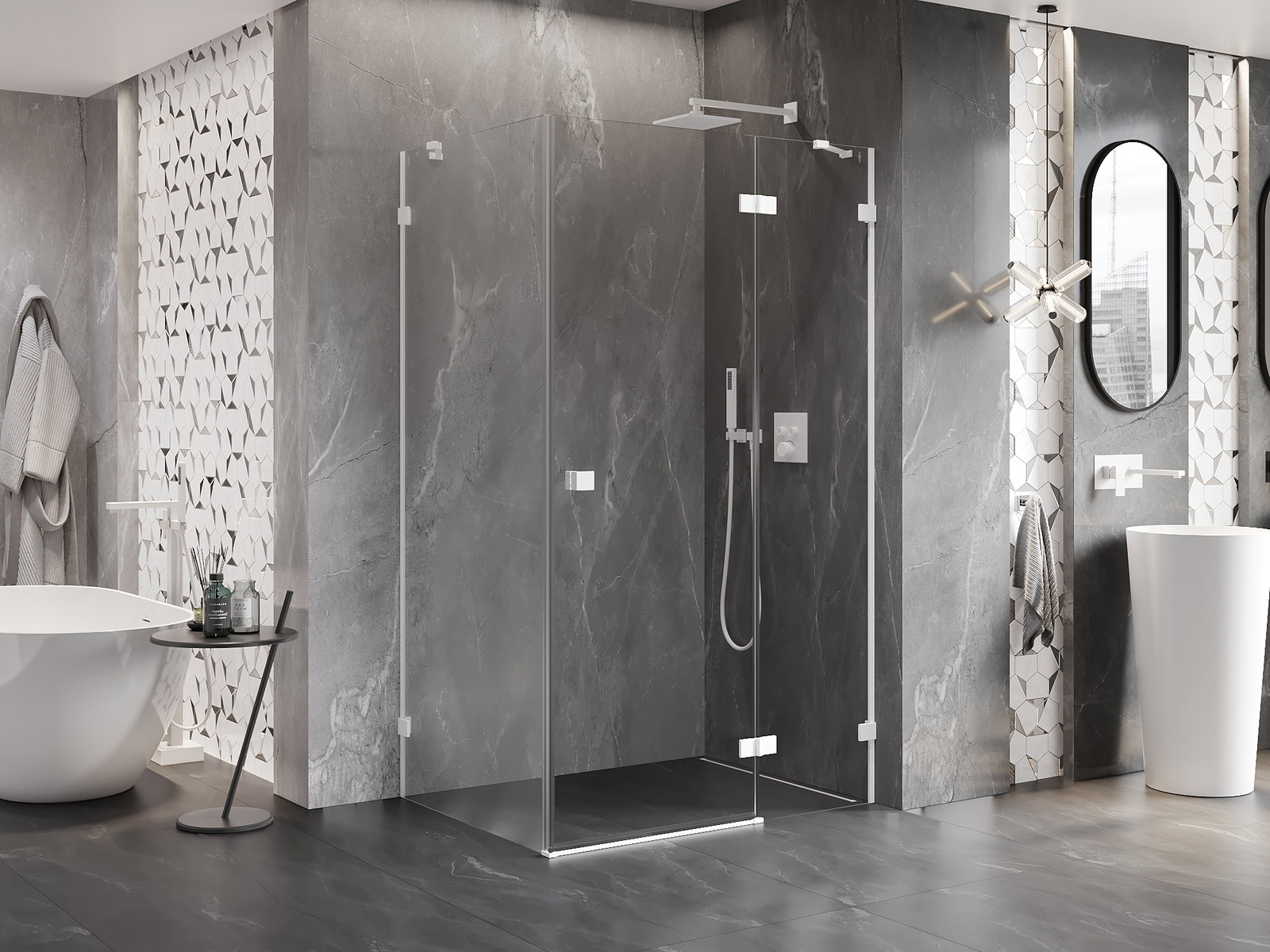 Οι σφιγκτήρες και οι μεντεσέδες είναι κατασκευασμένοι από πολύ ανθεκτικό ορείχαλκο και επιπλέον δημιουργούν μια ευθυγραμμισμένη επιφάνεια γυαλιού. Είναι μια εξαιρετική επιλογή που συνδυάζει κομψότητα, ανθεκτικότητα και σύγχρονο σχεδιασμό. Χάρη σε αυτές τις λύσεις, η ντουζιέρα κερδίζει σε αισθητική και ταυτόχρονα διευκολύνουν τη διατήρηση της καθαριότητας.