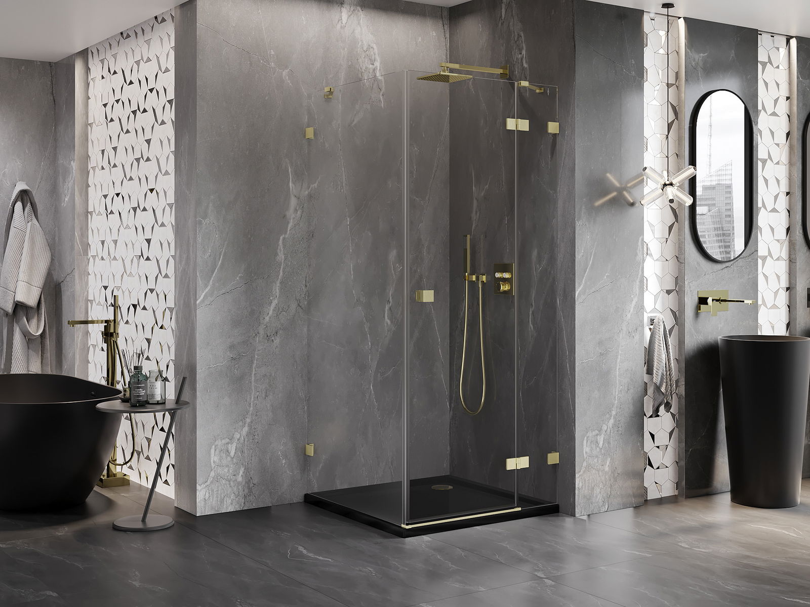 Οι σφιγκτήρες και οι μεντεσέδες είναι κατασκευασμένοι από πολύ ανθεκτικό ορείχαλκο και επιπλέον δημιουργούν μια ευθυγραμμισμένη επιφάνεια γυαλιού. Είναι μια εξαιρετική επιλογή που συνδυάζει κομψότητα, ανθεκτικότητα και σύγχρονο σχεδιασμό. Χάρη σε αυτές τις λύσεις, η ντουζιέρα κερδίζει σε αισθητική και ταυτόχρονα διευκολύνουν τη διατήρηση της καθαριότητας.