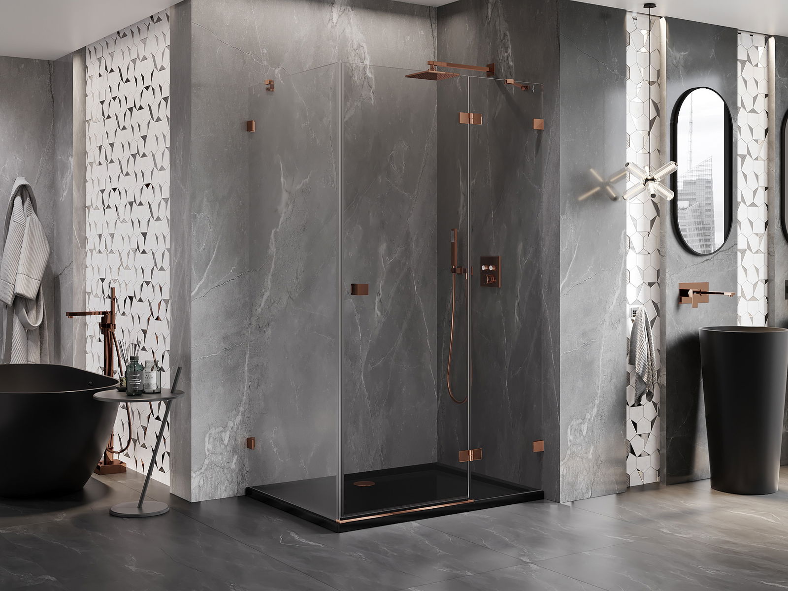 Οι σφιγκτήρες και οι μεντεσέδες είναι κατασκευασμένοι από πολύ ανθεκτικό ορείχαλκο και επιπλέον δημιουργούν μια ευθυγραμμισμένη επιφάνεια γυαλιού. Είναι μια εξαιρετική επιλογή που συνδυάζει κομψότητα, ανθεκτικότητα και σύγχρονο σχεδιασμό. Χάρη σε αυτές τις λύσεις, η ντουζιέρα κερδίζει σε αισθητική και ταυτόχρονα διευκολύνουν τη διατήρηση της καθαριότητας.