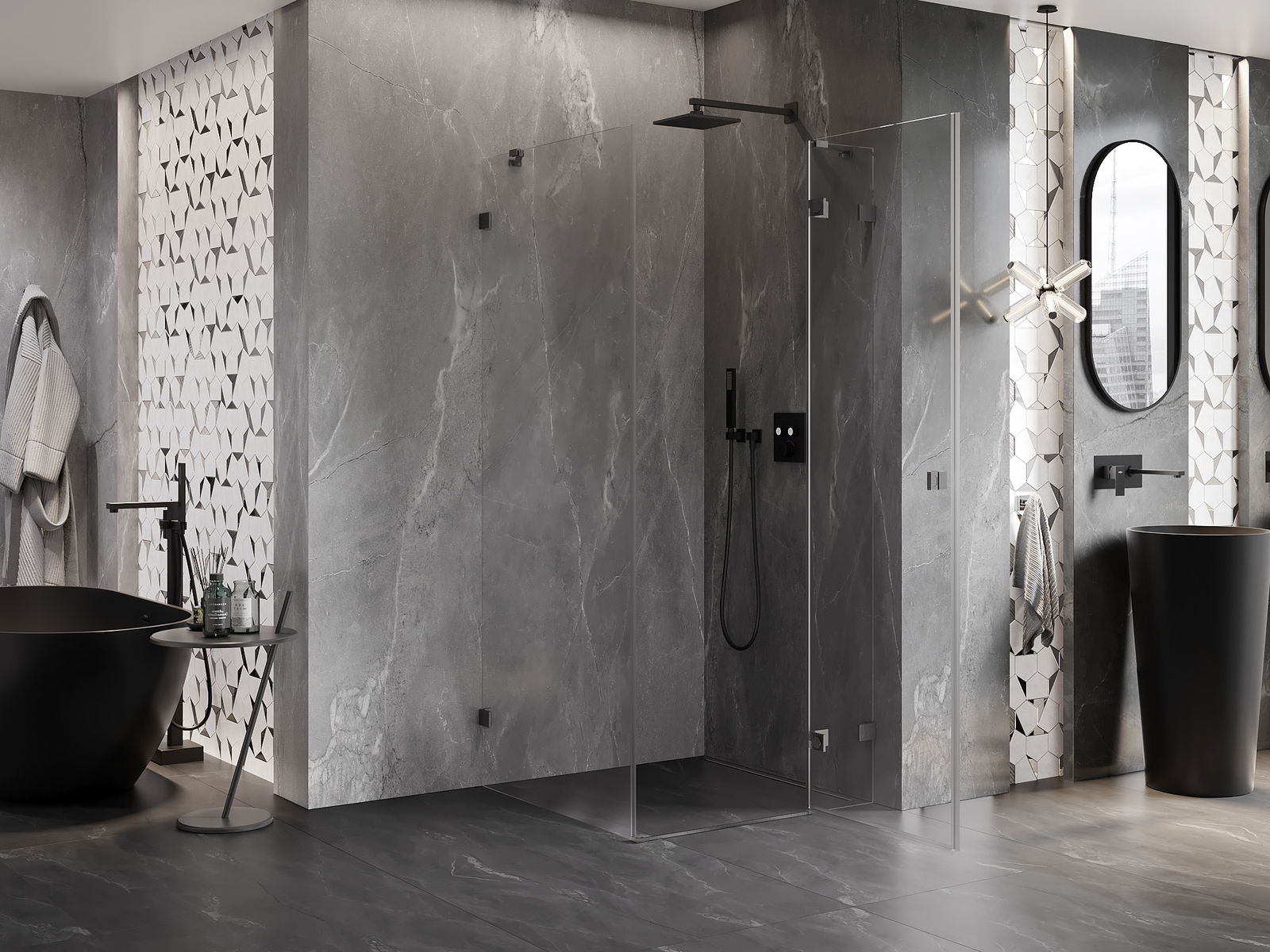 Οι σφιγκτήρες και οι μεντεσέδες είναι κατασκευασμένοι από πολύ ανθεκτικό ορείχαλκο και επιπλέον δημιουργούν μια ευθυγραμμισμένη επιφάνεια γυαλιού. Είναι μια εξαιρετική επιλογή που συνδυάζει κομψότητα, ανθεκτικότητα και σύγχρονο σχεδιασμό. Χάρη σε αυτές τις λύσεις, η ντουζιέρα κερδίζει σε αισθητική και ταυτόχρονα διευκολύνουν τη διατήρηση της καθαριότητας.