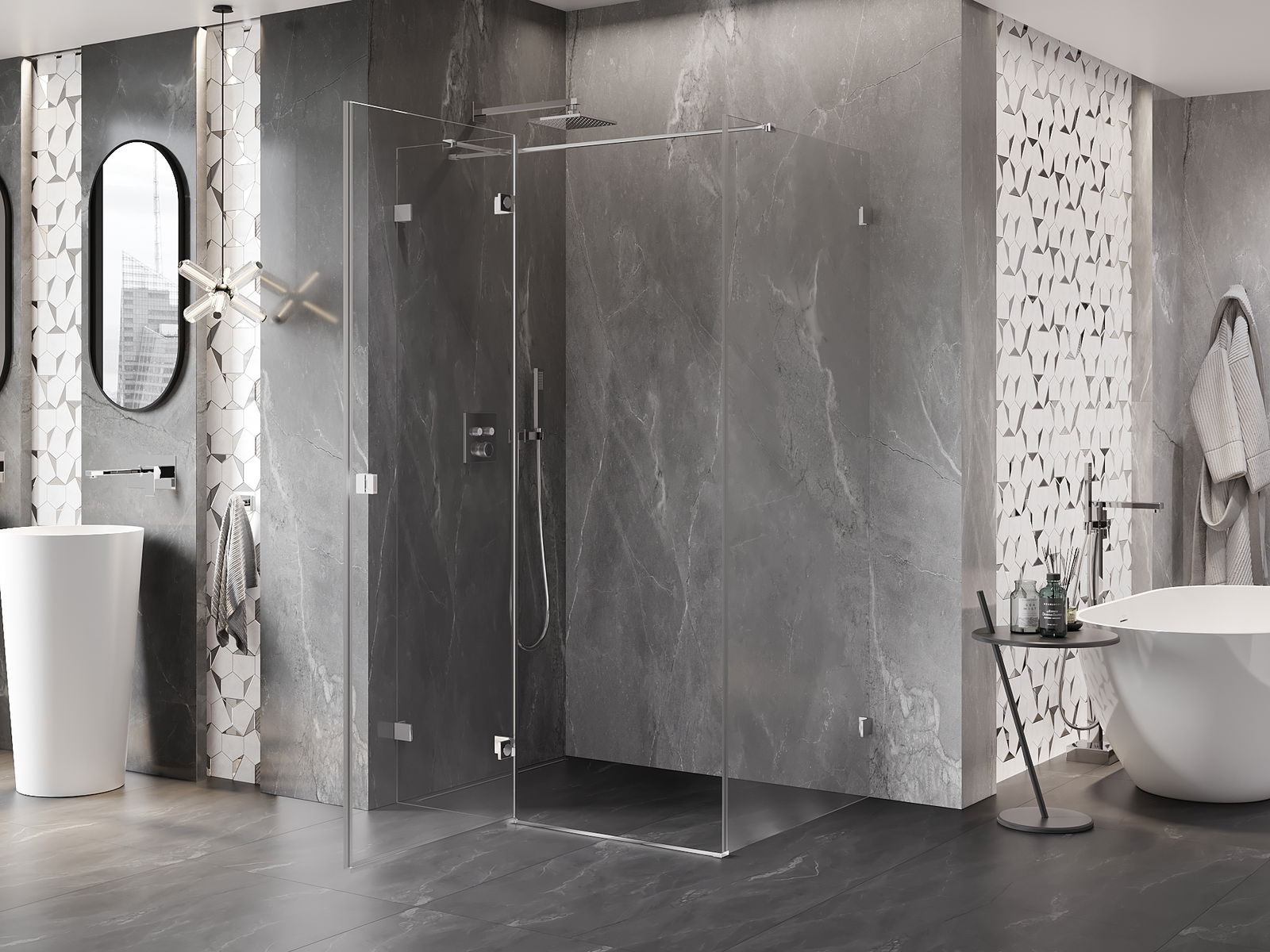 Οι σφιγκτήρες και οι μεντεσέδες είναι κατασκευασμένοι από πολύ ανθεκτικό ορείχαλκο και επιπλέον δημιουργούν μια ευθυγραμμισμένη επιφάνεια γυαλιού. Είναι μια εξαιρετική επιλογή που συνδυάζει κομψότητα, ανθεκτικότητα και σύγχρονο σχεδιασμό. Χάρη σε αυτές τις λύσεις, η ντουζιέρα κερδίζει σε αισθητική και ταυτόχρονα διευκολύνουν τη διατήρηση της καθαριότητας.