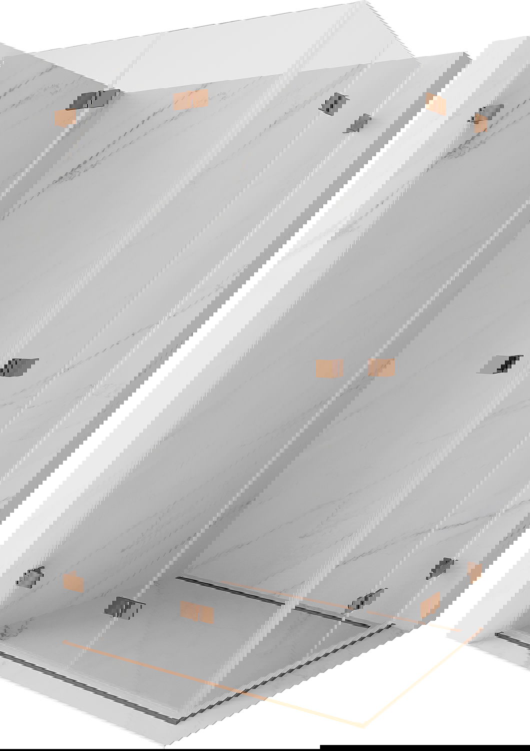 Οι σφιγκτήρες και οι μεντεσέδες είναι κατασκευασμένοι από πολύ ανθεκτικό ορείχαλκο και επιπλέον δημιουργούν μια ευθυγραμμισμένη επιφάνεια γυαλιού. Είναι μια εξαιρετική επιλογή που συνδυάζει κομψότητα, ανθεκτικότητα και σύγχρονο σχεδιασμό. Χάρη σε αυτές τις λύσεις, η ντουζιέρα κερδίζει σε αισθητική και ταυτόχρονα διευκολύνουν τη διατήρηση της καθαριότητας.