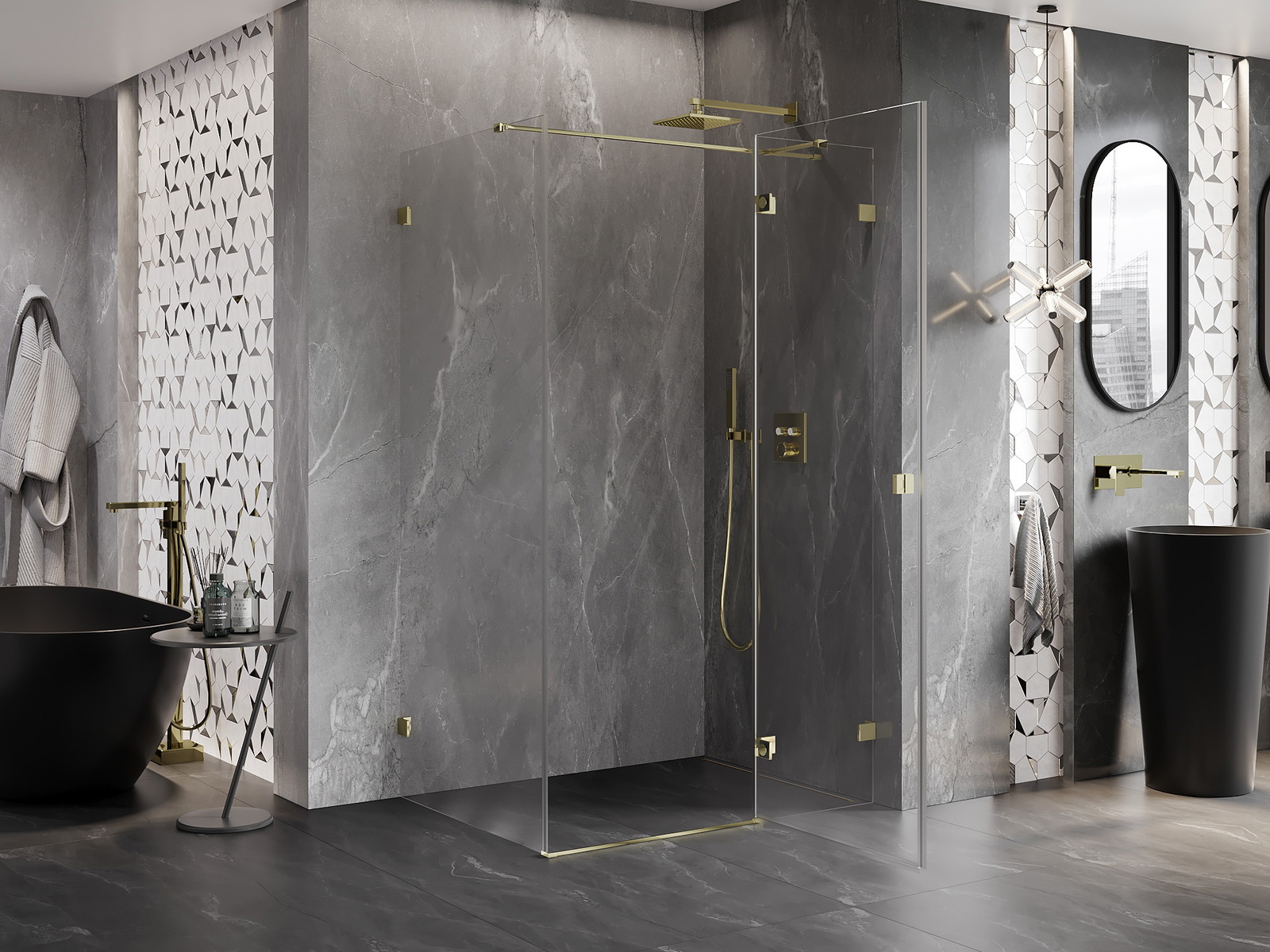 Οι σφιγκτήρες και οι μεντεσέδες είναι κατασκευασμένοι από πολύ ανθεκτικό ορείχαλκο και επιπλέον δημιουργούν μια ευθυγραμμισμένη επιφάνεια γυαλιού. Είναι μια εξαιρετική επιλογή που συνδυάζει κομψότητα, ανθεκτικότητα και σύγχρονο σχεδιασμό. Χάρη σε αυτές τις λύσεις, η ντουζιέρα κερδίζει σε αισθητική και ταυτόχρονα διευκολύνουν τη διατήρηση της καθαριότητας.