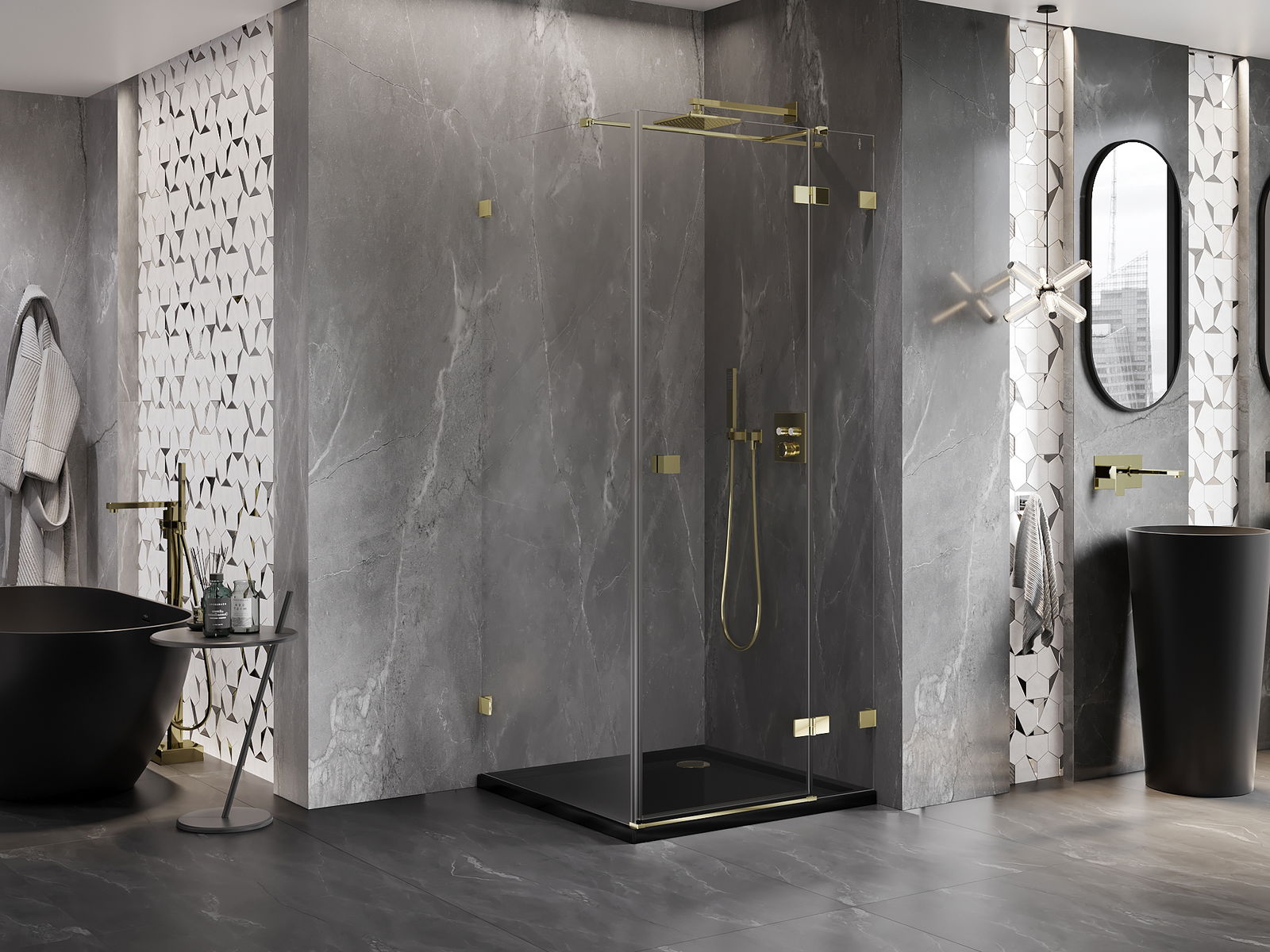 Οι σφιγκτήρες και οι μεντεσέδες είναι κατασκευασμένοι από πολύ ανθεκτικό ορείχαλκο και επιπλέον δημιουργούν μια ευθυγραμμισμένη επιφάνεια γυαλιού. Είναι μια εξαιρετική επιλογή που συνδυάζει κομψότητα, ανθεκτικότητα και σύγχρονο σχεδιασμό. Χάρη σε αυτές τις λύσεις, η ντουζιέρα κερδίζει σε αισθητική και ταυτόχρονα διευκολύνουν τη διατήρηση της καθαριότητας.