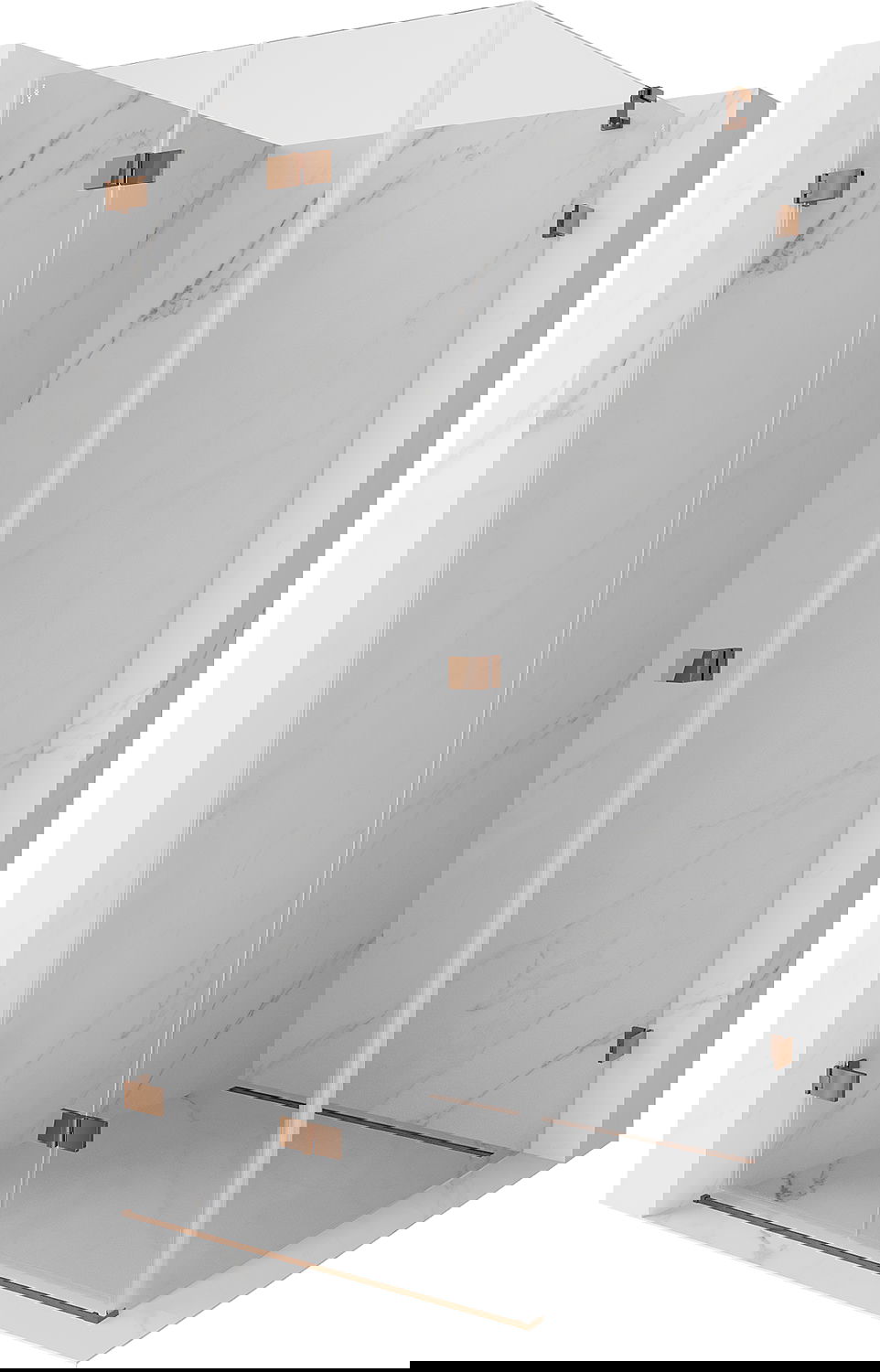 Οι σφιγκτήρες και οι μεντεσέδες είναι κατασκευασμένοι από πολύ ανθεκτικό ορείχαλκο και επιπλέον δημιουργούν μια ευθυγραμμισμένη επιφάνεια γυαλιού. Είναι μια εξαιρετική επιλογή που συνδυάζει κομψότητα, ανθεκτικότητα και σύγχρονο σχεδιασμό. Χάρη σε αυτές τις λύσεις, η ντουζιέρα κερδίζει σε αισθητική και ταυτόχρονα διευκολύνουν τη διατήρηση της καθαριότητας.