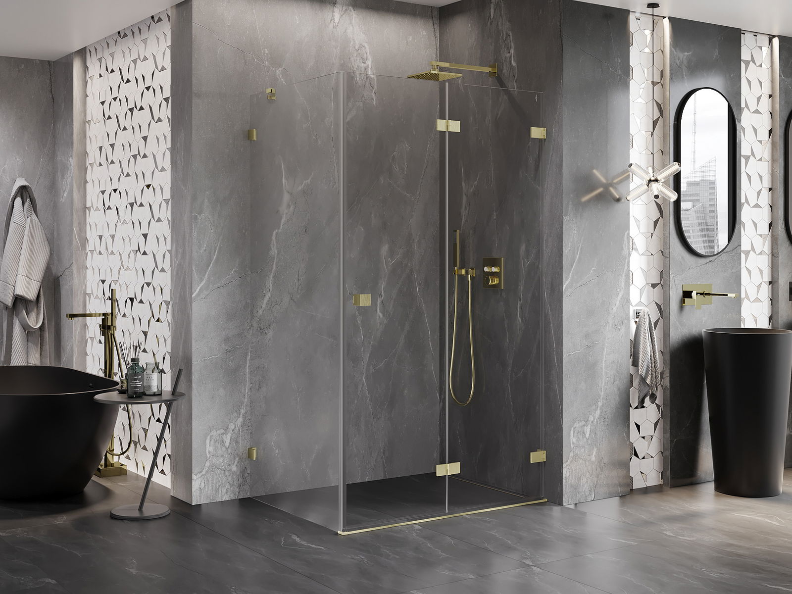 Οι σφιγκτήρες και οι μεντεσέδες είναι κατασκευασμένοι από πολύ ανθεκτικό ορείχαλκο και επιπλέον δημιουργούν μια ευθυγραμμισμένη επιφάνεια γυαλιού. Είναι μια εξαιρετική επιλογή που συνδυάζει κομψότητα, ανθεκτικότητα και σύγχρονο σχεδιασμό. Χάρη σε αυτές τις λύσεις, η ντουζιέρα κερδίζει σε αισθητική και ταυτόχρονα διευκολύνουν τη διατήρηση της καθαριότητας.