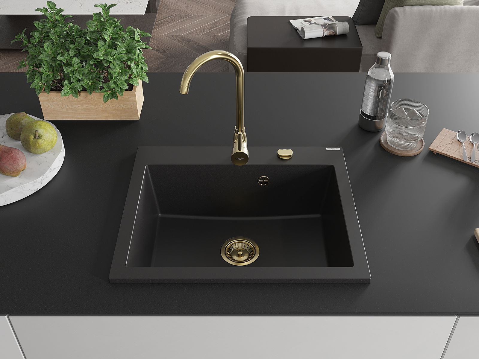 Mexen Elix Νεροχύτης γρανίτη μονός 600 x 500 mm, μαύρος, σιφόν χρυσό - 6525601005-77-G