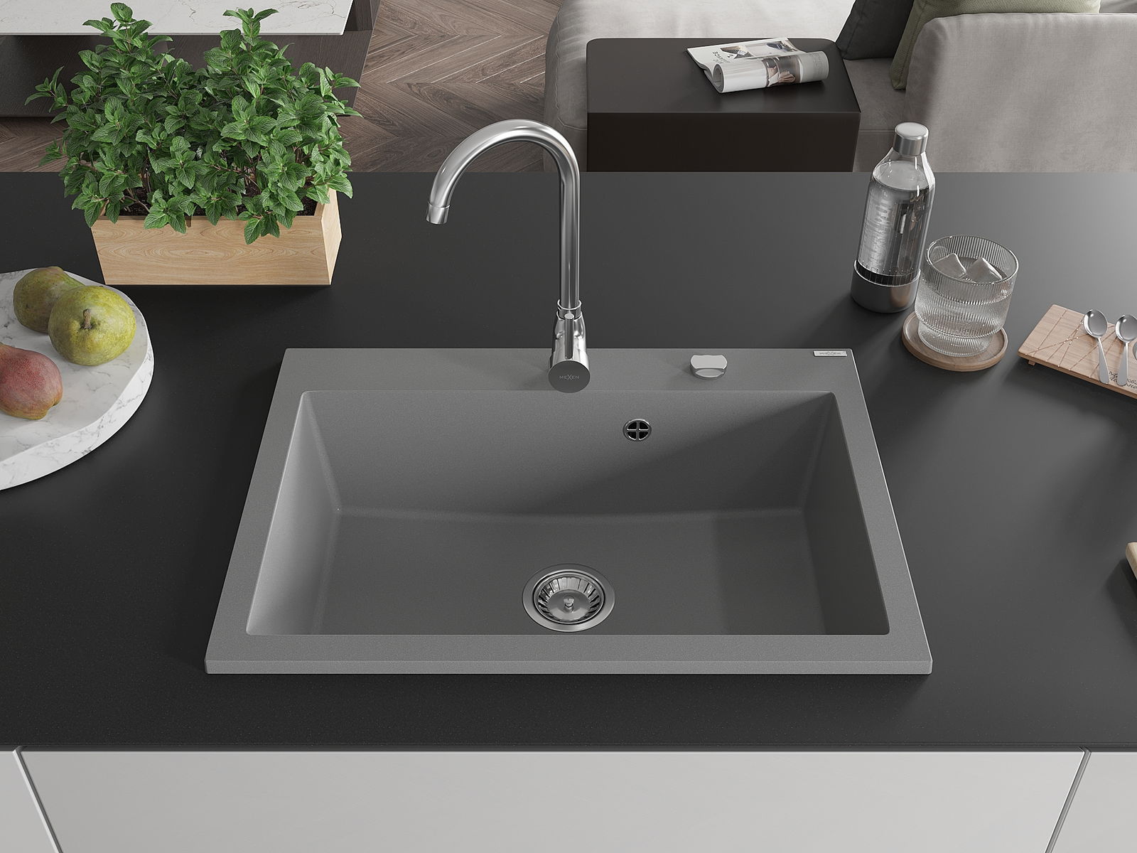 Mexen Elix νεροχύτης γρανίτης 1-θάλαμος 700 x 500 mm, γκρι, σιφόνι χρώμιο