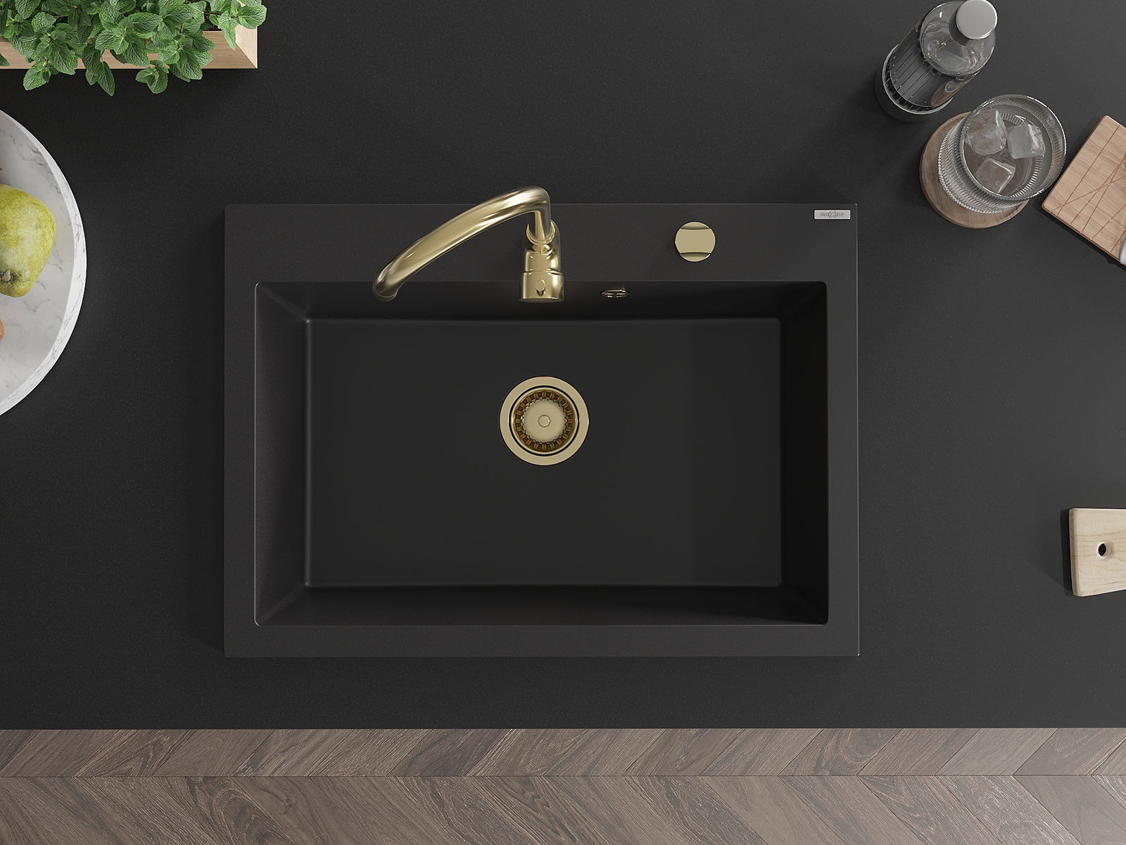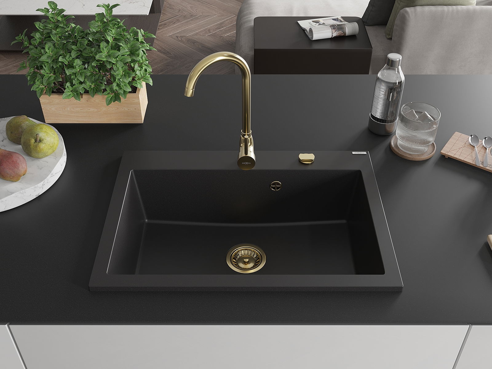 Mexen Elix νεροχύτης γρανίτης με 1 θάλαμο 700 x 500 mm, μαύρος, σιφόνι χρυσό
